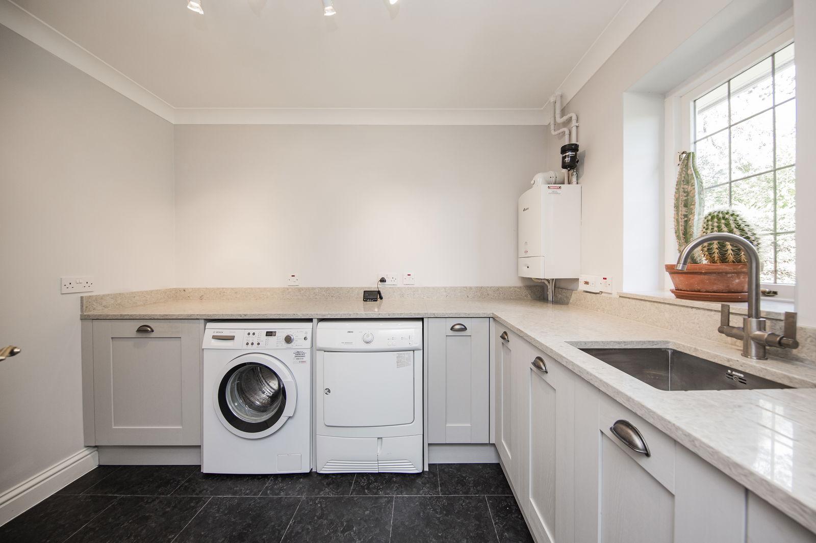 UTILITY ROOM: Range of base units with quartz worktops/upstands over incorporating a Blanco sink with mixer tap. Space for washing machine and tumble dryer, Worcester Bosch gas boiler, luxury vinyl tile flooring and window.