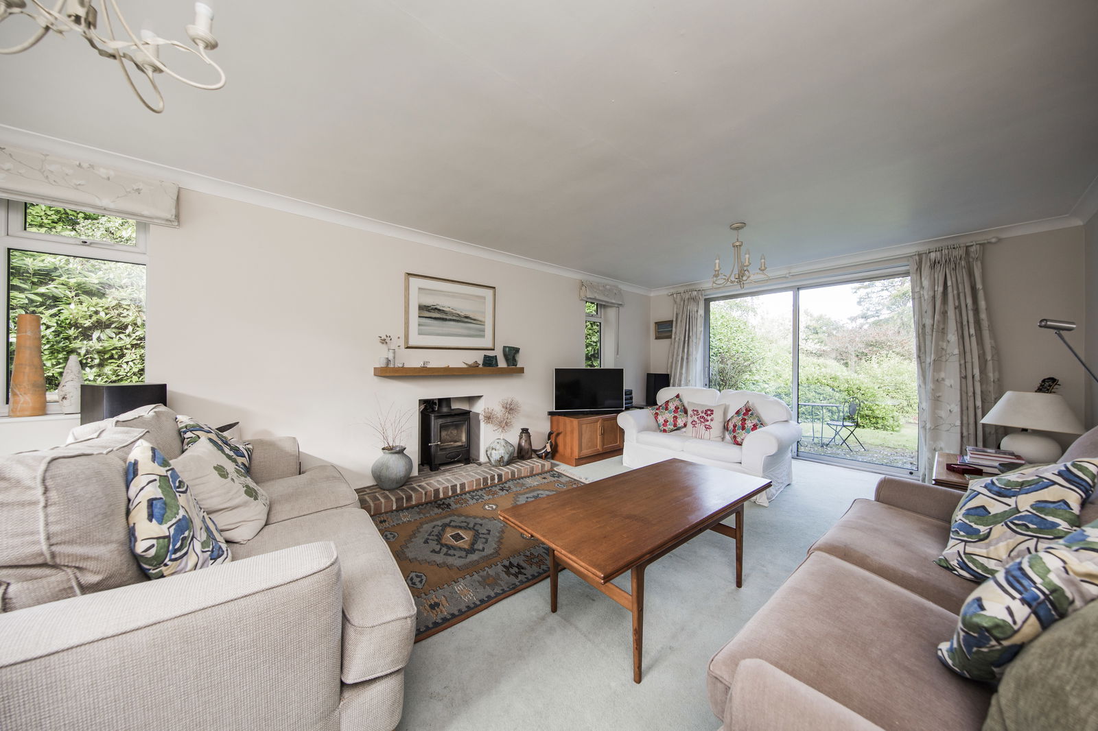 SITTING ROOM: A triple aspect room featuring a fireplace incorporating a log burner with brick hearth and oak bressummer. Two radiators, fitted carpet, windows to front and side and sliding patio doors opening onto the rear garden.