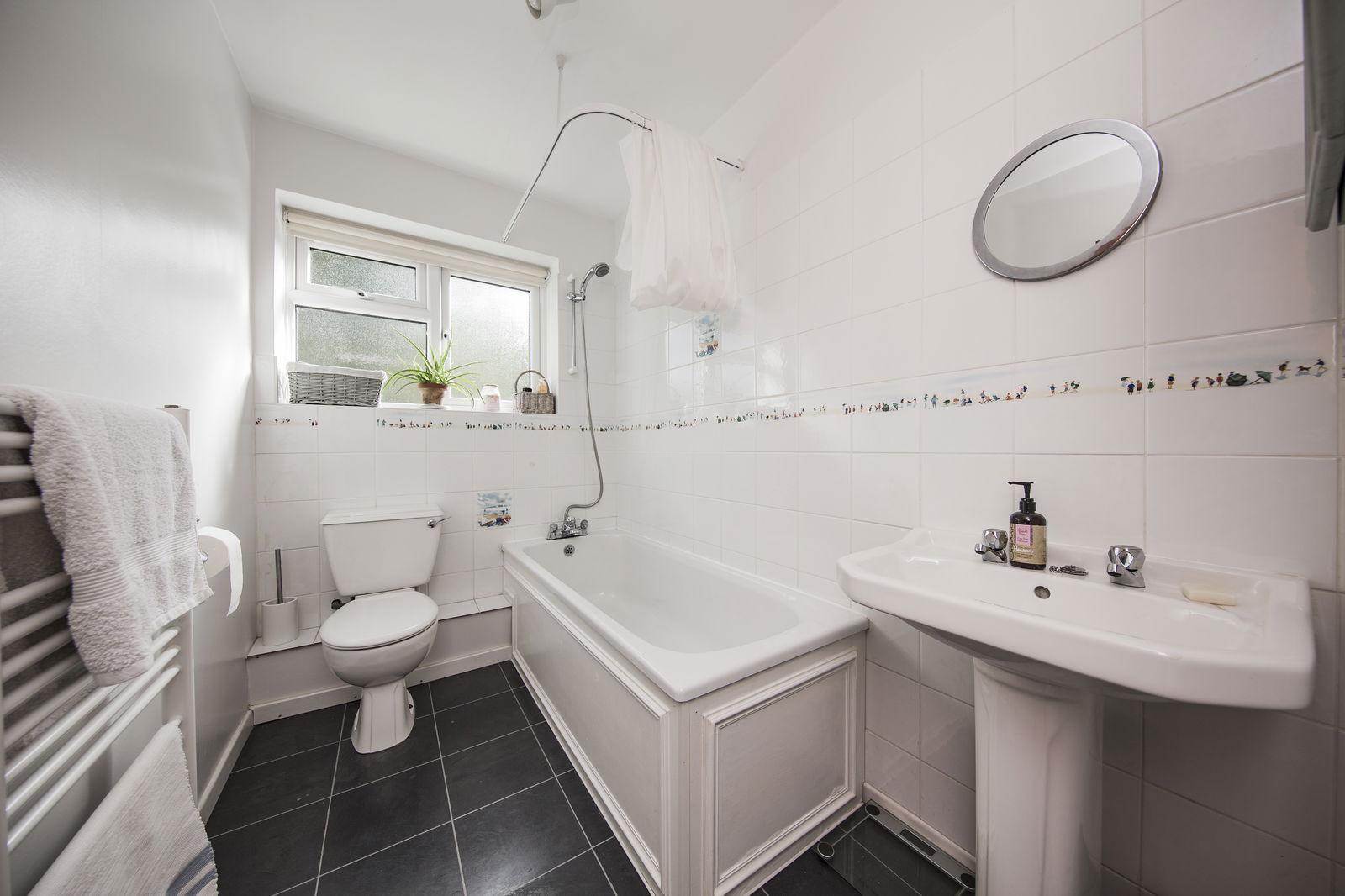 FAMILY BATHROOM: Panelled bath with shower attachment over and tiled surrounds, dual flush low-level wc, pedestal wash hand basin. Heated towel rail and tiled flooring.