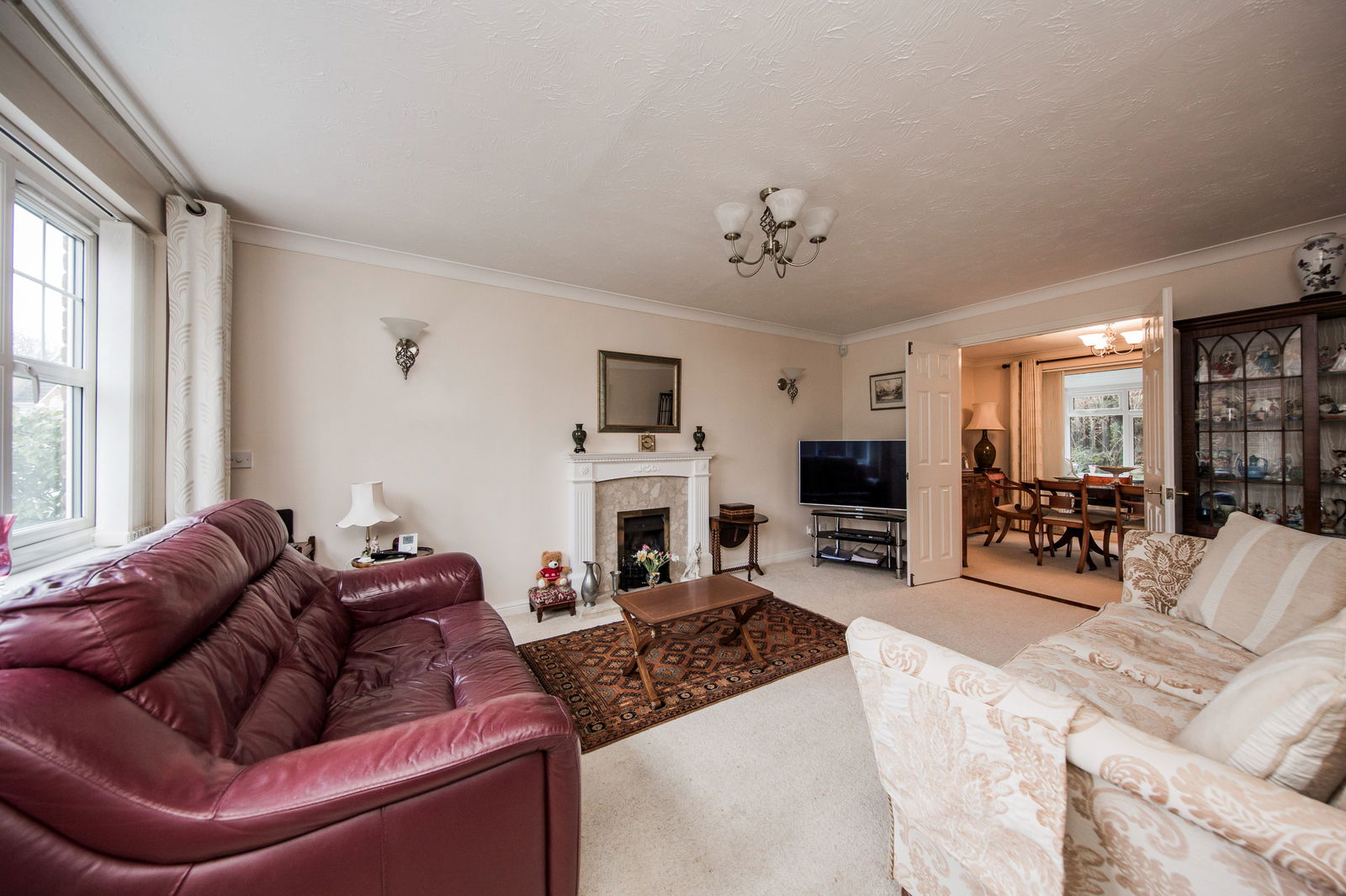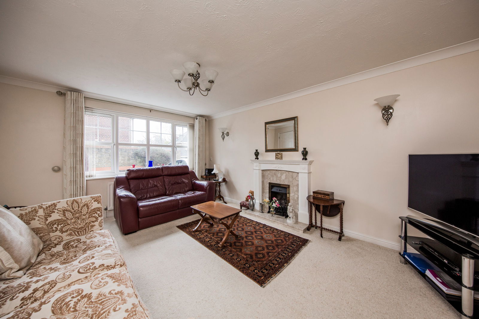 Feature gas fireplace with marble effect surround and wooden mantel. Radiator, fitted carpet and large window to front.