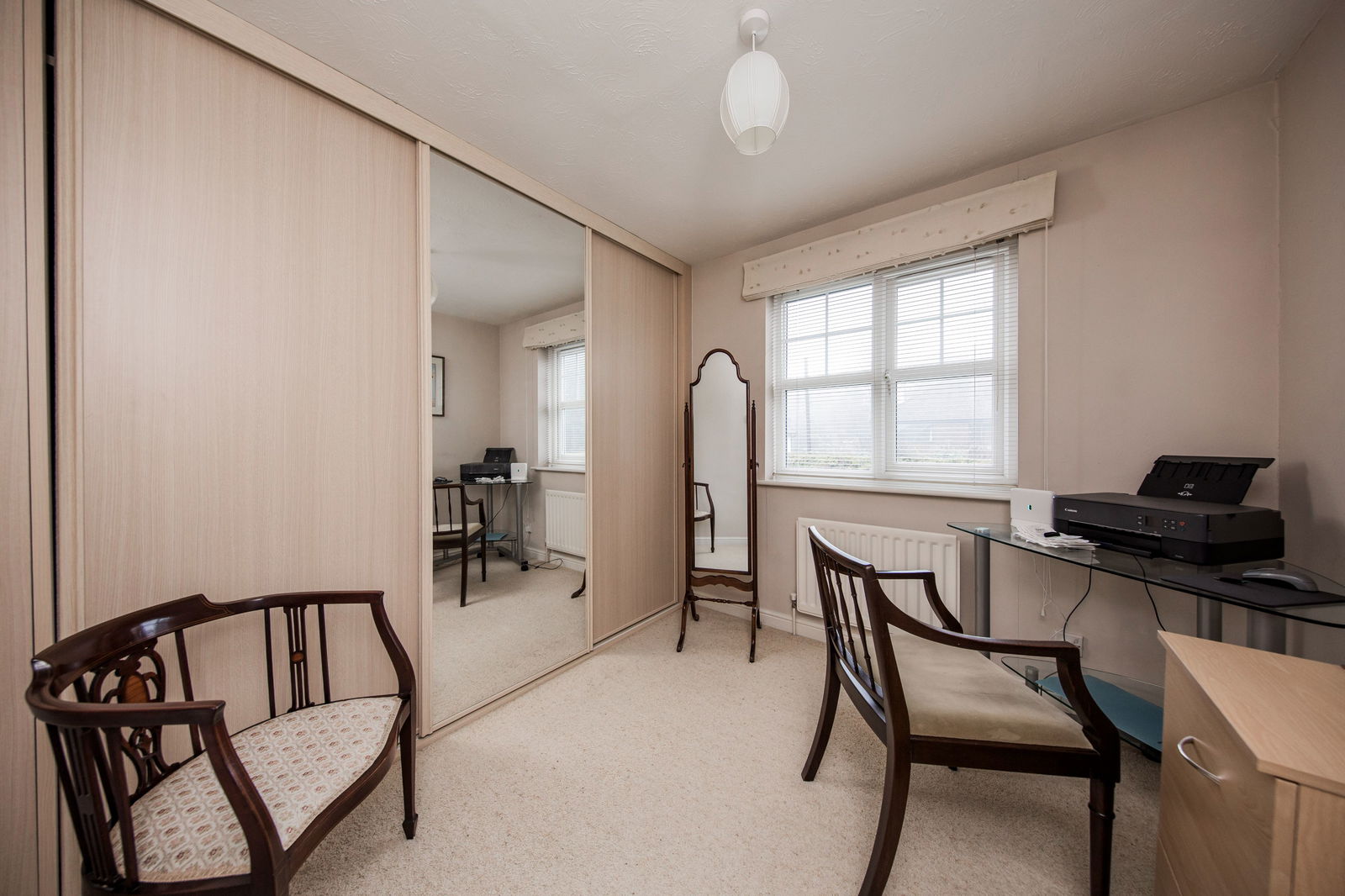 Storage cupboard with a combination of shelving, drawer storage and hanging space. Fitted carpet radiator, large window to front and door into: