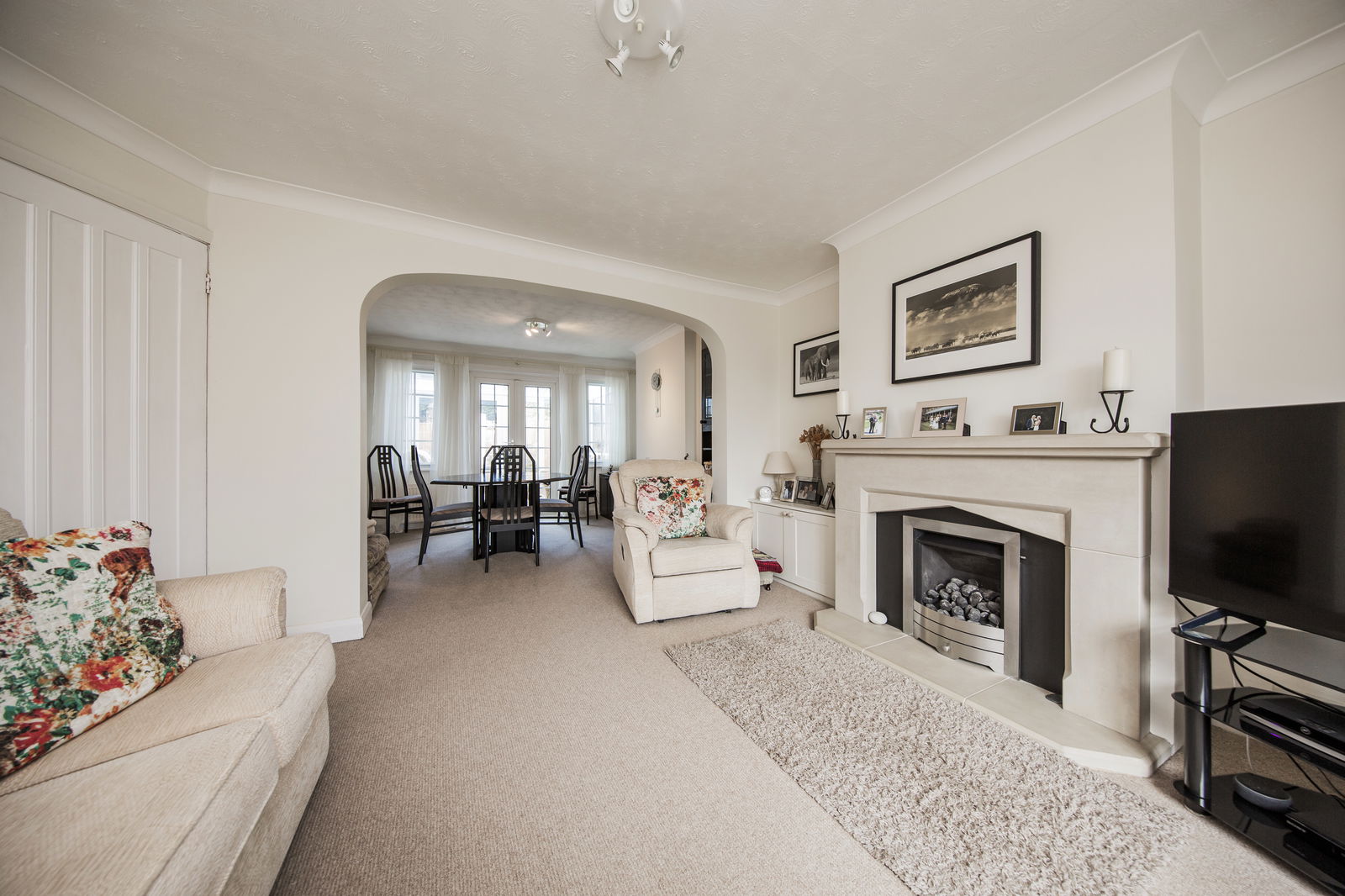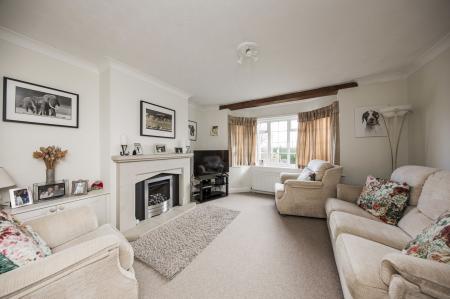 Beautiful limestone fireplace incorporating a coal affect gas fire insert (not tested), fitted low level cupboard, fitted carpet, radiator, wooden beam and bay Crittall window to front overlooking the garden.