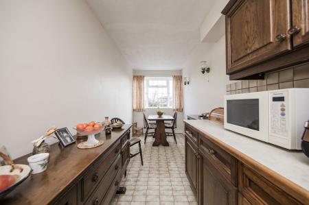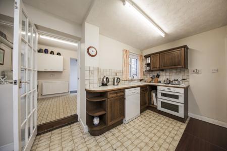 A traditional style range of high and low level units with under unit lighting and rolltop work surfaces incorporating a one and half bowl sink. Fan assisted oven with 4-ring electric hob, extractor fan and space for a dishwasher and low level fridge. Good size understairs larder cupboard, breakfast bar with seating area, radiator, tile effect laminate flooring and window overlooking the rear garden.