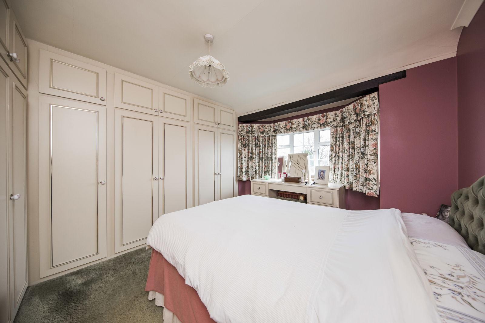 BEDROOM: Glass fronted fitted wardrobes with high level cupboards, areas of shelving and a dressing table with storage. Mirrored feature wall, fitted carpet, radiator and Crittall window overlooking the rear garden.