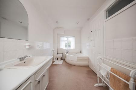 FAMILY BATHROOM: An extended bathroom featuring a corner bath with traditional style taps and handheld shower attachment, fully tiled corner cubicle with Mira shower, low level wc and twin sinks set into a vanity unit with tiled splashback and mirrors above. Fitted carpet, part tiled walling and obscured window to rear.