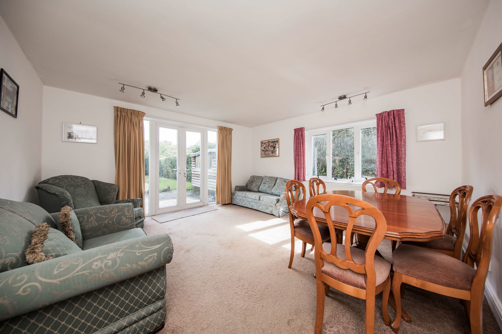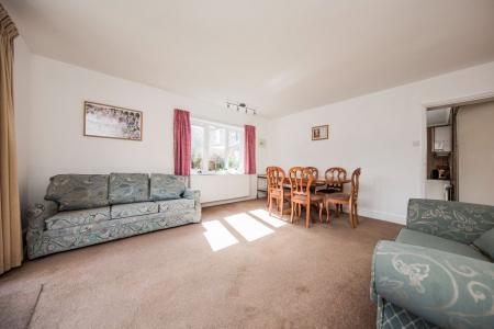 Plenty of space for sitting and dining room furniture, fitted carpet, radiator, window to side and French doors open out to a paved patio and garden beyond.