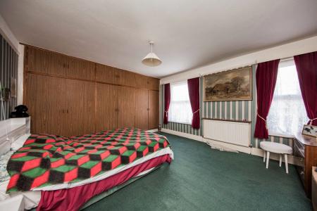 Triple fitted wardrobes, pull out drawer storage with fitted glass mirror and cupboards above. Picture rail, fitted carpet, radiator and two windows to front.