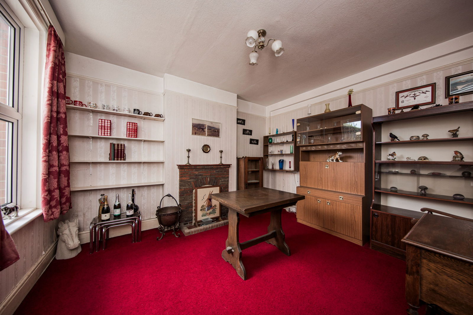 Traditional style feature fireplace with brick hearth and mantle. Picture rail, wall lighting and bay window to front.
