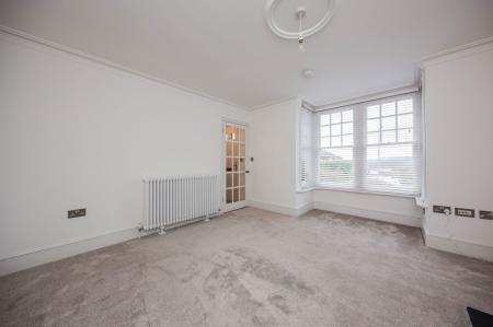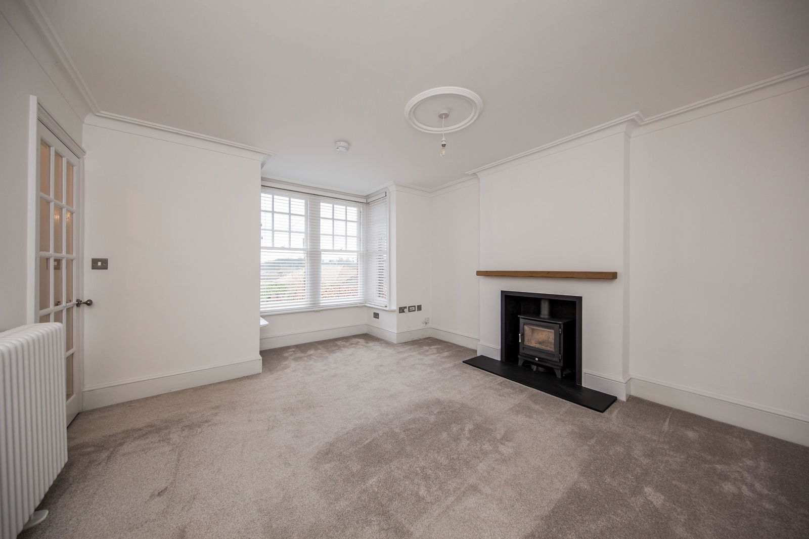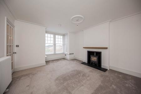 Feature fireplace incorporating an inset Chesneys wood burning stove with oak mantel and granite hearth, ceiling cornicing with ceiling rose, carpet as fitted, radiator and box bay sash window to front with fitted blind.