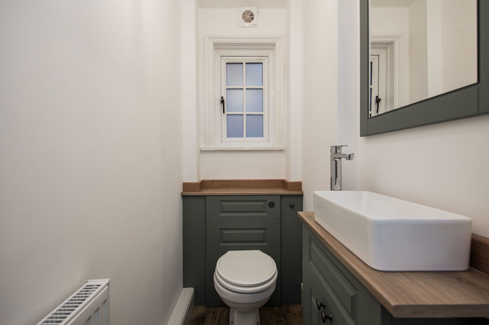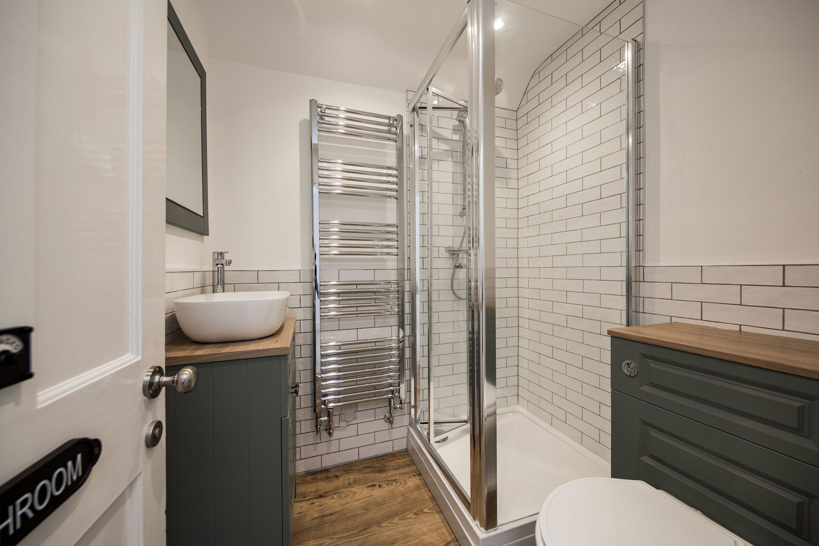 Tiled cubicle with integrated shower and attachment, dual flush low level wc and vanity wash basin with storage under. Chrome heated column, mirrored wall, radiator, extractor fan and wood laminate flooring.