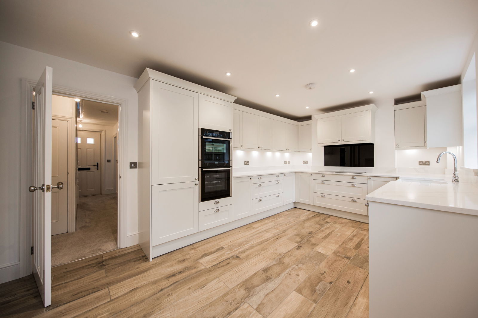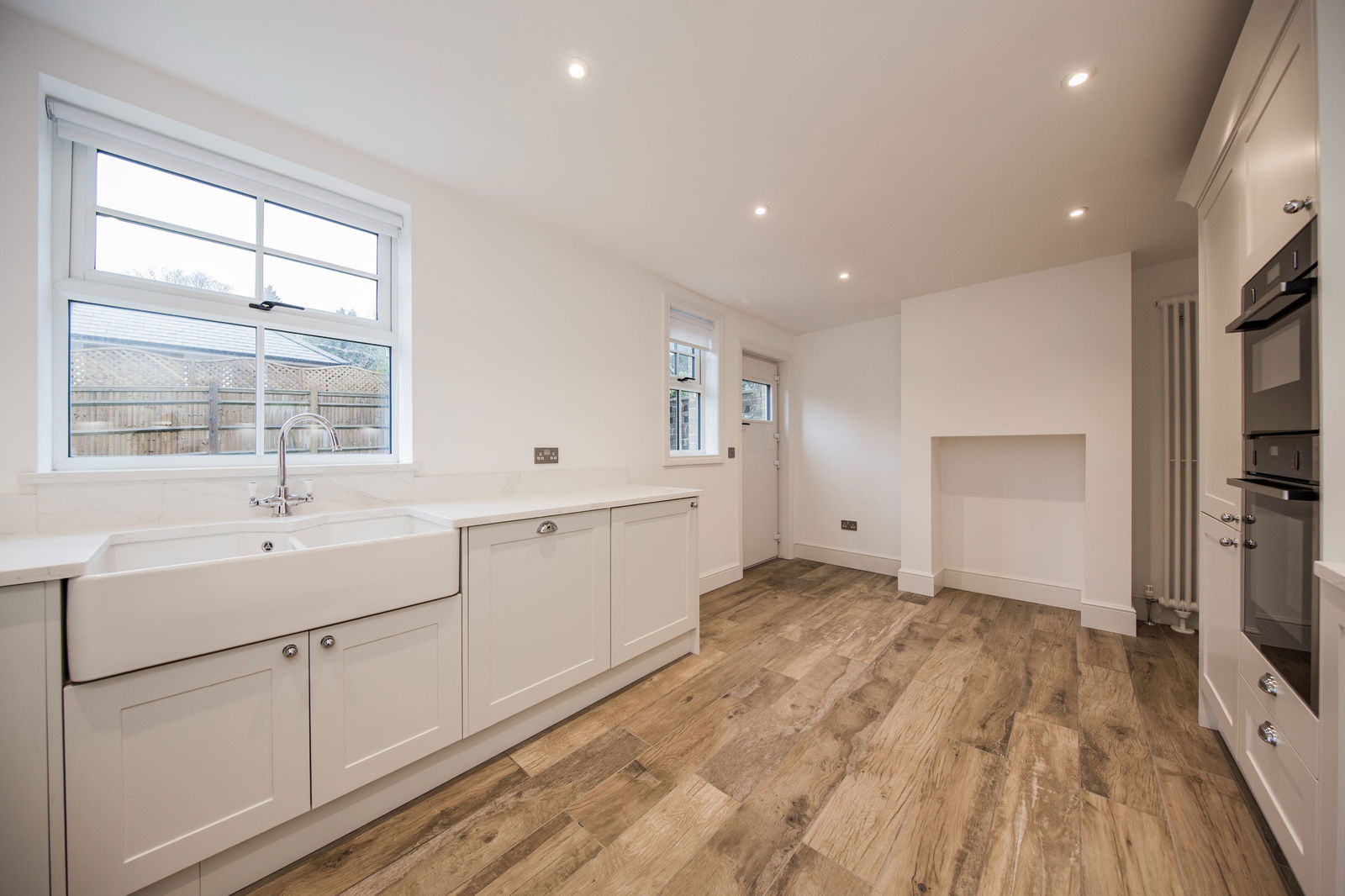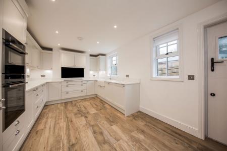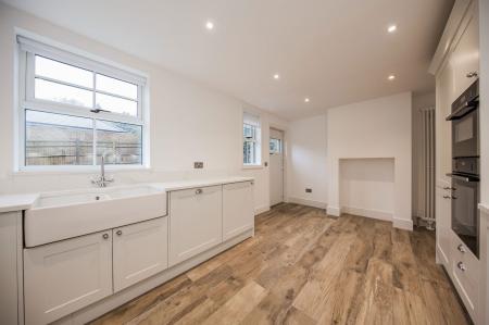 Bespoke Burnhill kitchen featuring a range of wall, base and drawer units with Quartz worktops incorporating a twin Butler sink. Neff appliances include five ring ceramic hob with extractor fan, eye level twin ovens and integrated appliances include a dishwasher, fridge, freezer and washer/dryer. Wood laminate flooring, column radiator, window to rear and composite glass panelled stable door to rear.