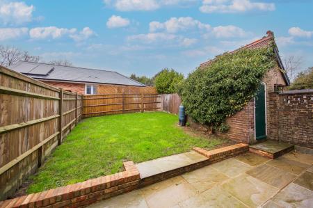 Indian sandstone patio adjacent to the property with the remainder of the garden being laid to lawn with brick outhouse.