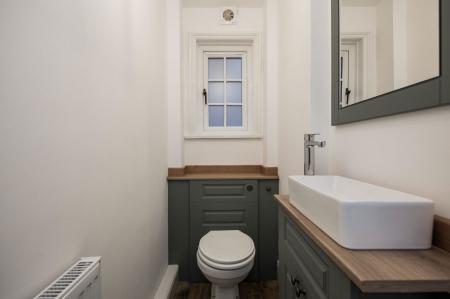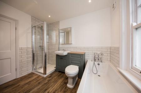 Tiled cubicle with integrated shower and attachment, wood panelled bath with shower attachment over, dual flush low level wc and vanity wash basin with storage under. Chrome heated radiator with column inset, mirrored cupboard, wood laminate flooring, part tiled walling, extractor fan and obscured sash window to rear.