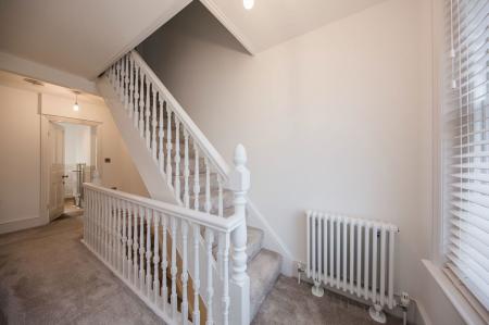 Stairs to first floor, understairs cupboard housing electric meters, carpet as fitted, column radiator and doors into: