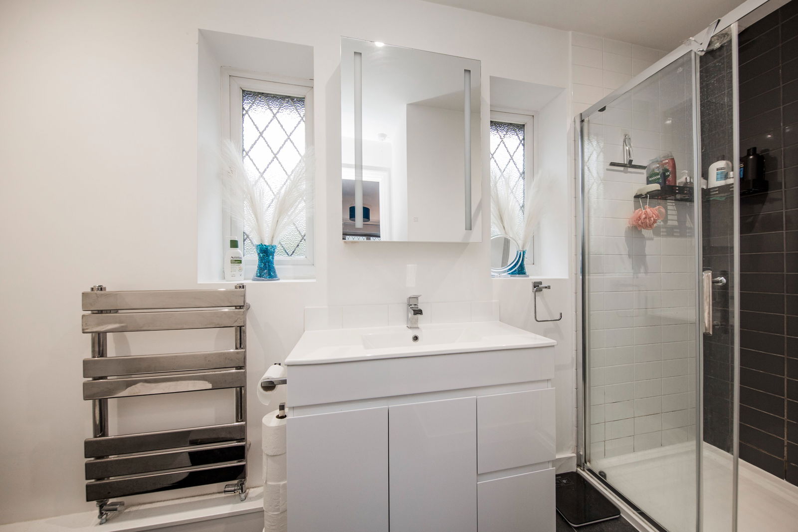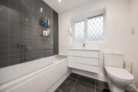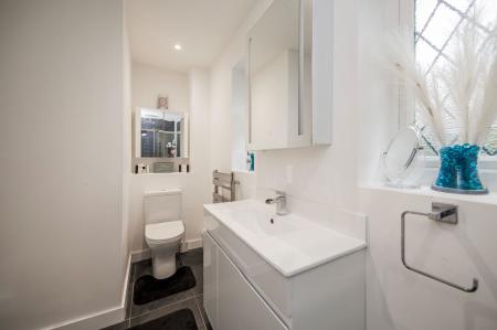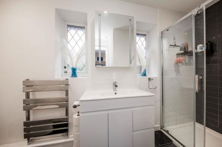Fully tiled cubicle with Aqualisa rainfall showerhead and additional wall mounted handheld shower attachment, low level wc, rectangular sink set into a contemporary high gloss vanity unit with storage and mirror above. Wall mounted chrome heated towel rail, grey tiled flooring, extractor fan and two obscured windows to the rear.