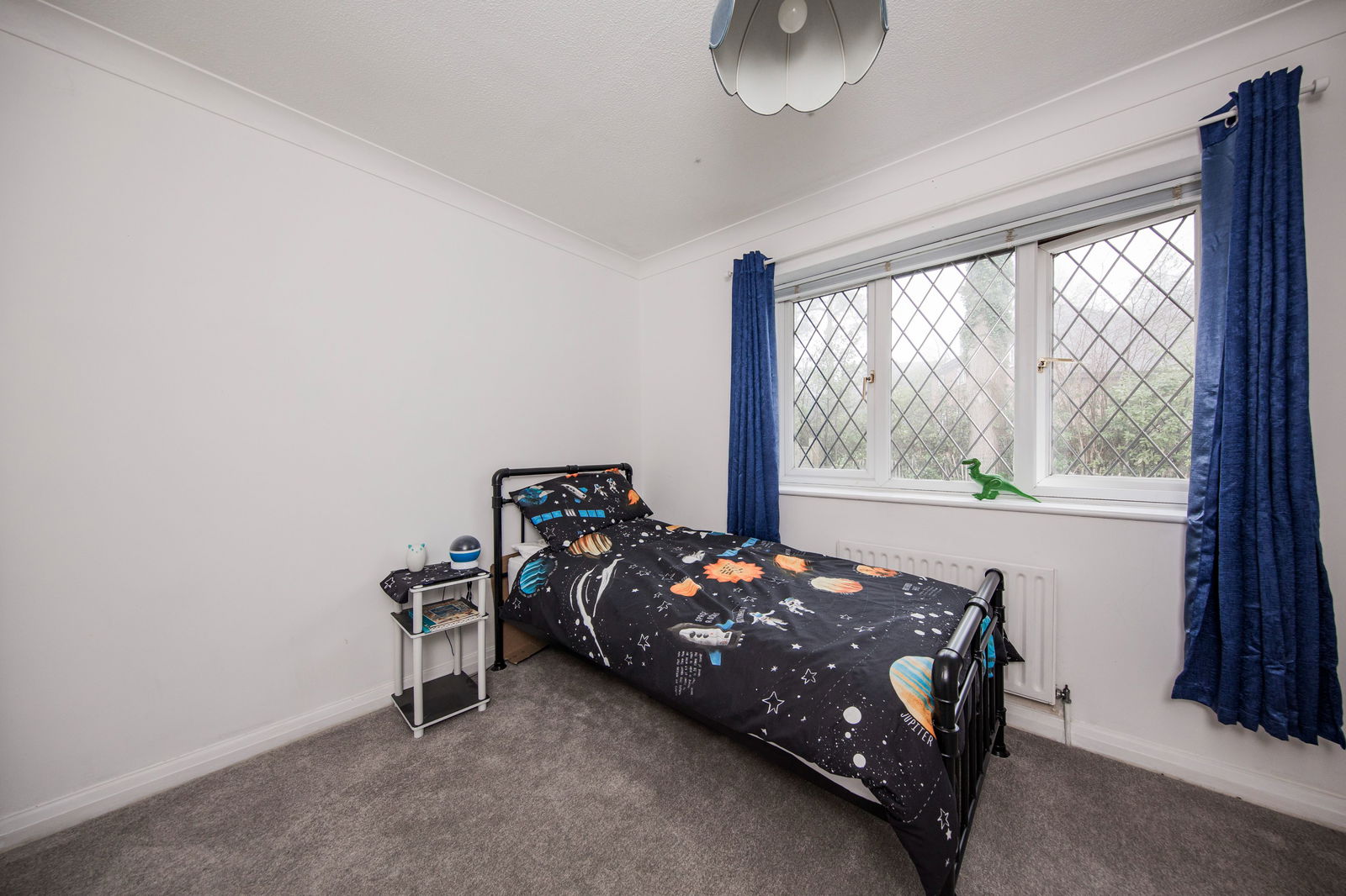 Single fitted wardrobe, recently fitted carpet, radiator and window overlooking the rear garden with fitted blind and curtains.