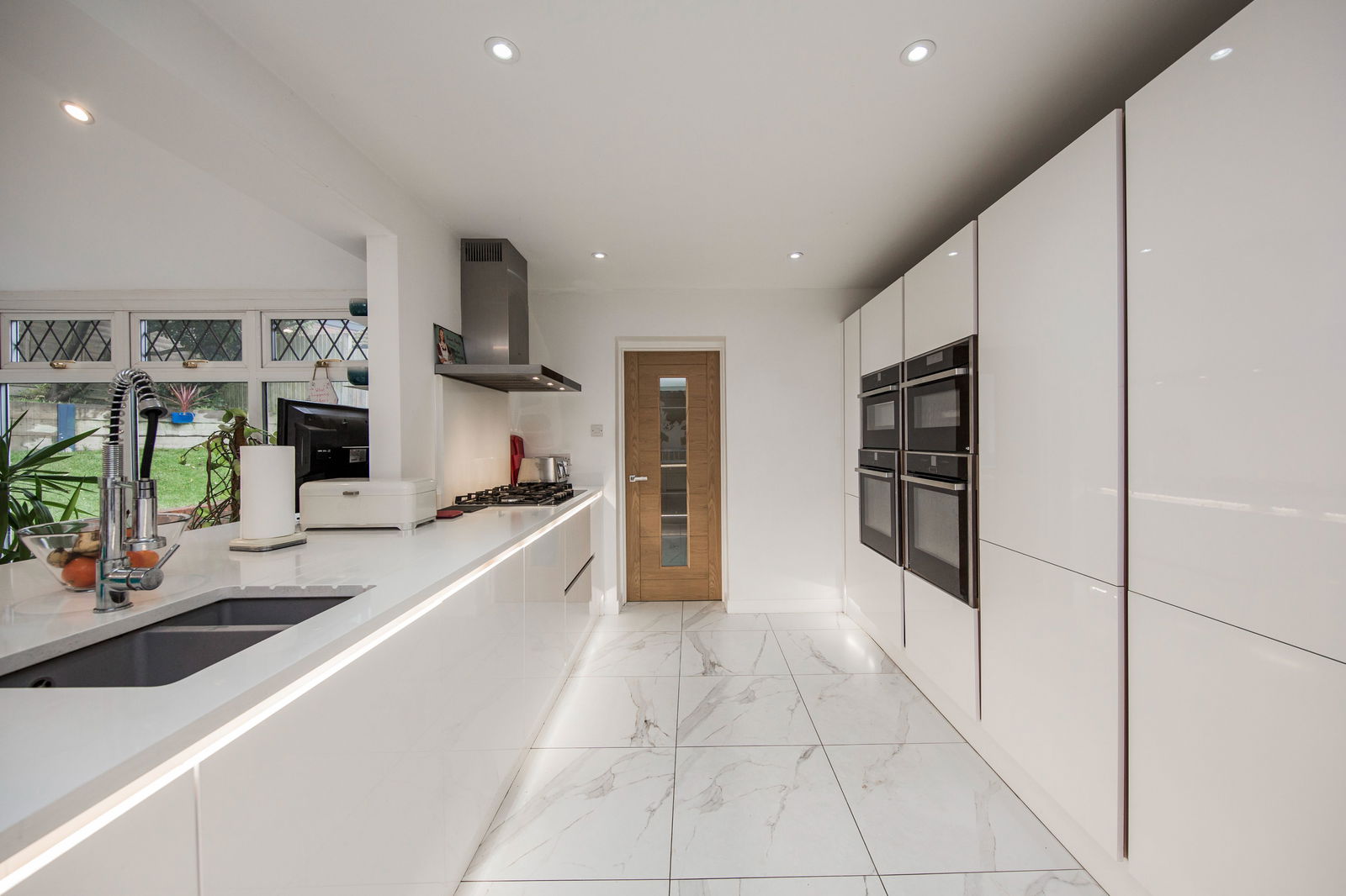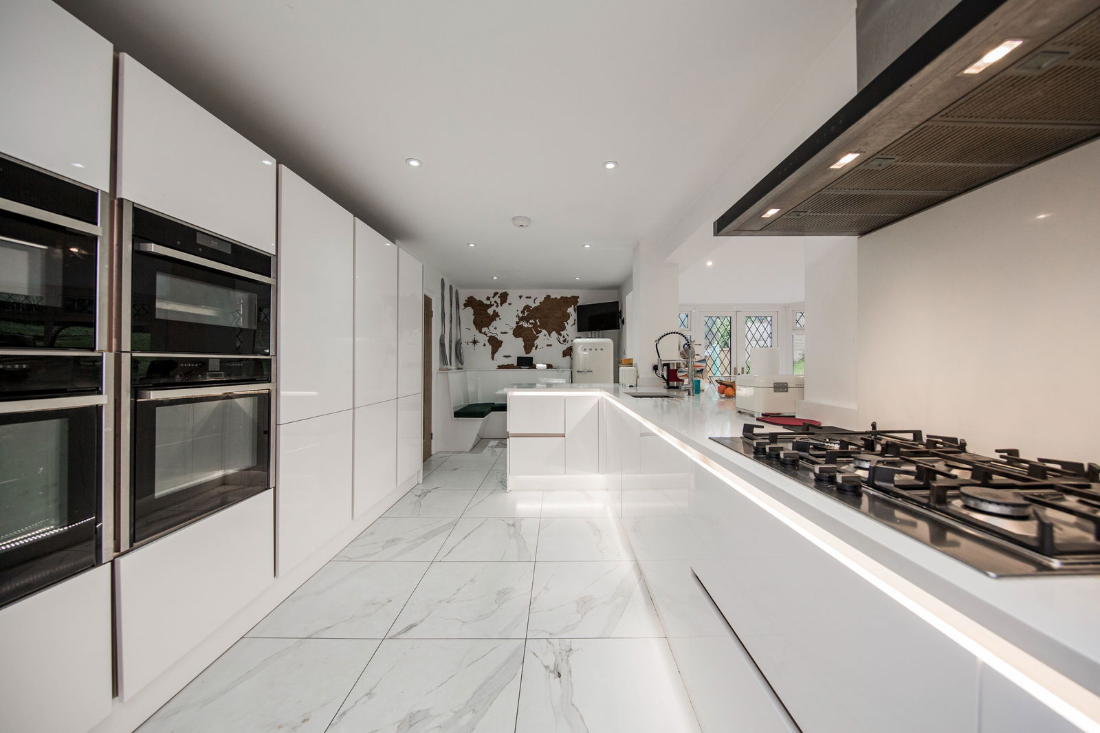 A contemporary white high gloss kitchen featuring a range of high and low level units with granite worktops, incorporating a one and half bowl sink with mixer tap. In additions is a built-in breakfast area with seating, storage underneath and a breakfast table. Appliances include a 5-ring gas hob with extractor fan above and integrated items include three ovens, a steam oven, tall fridge and a tall freezer. Tiled flooring with underfloor heating and a smoke alarm.