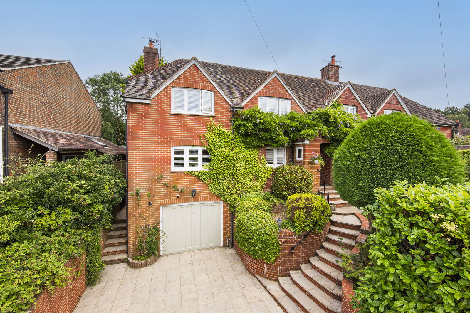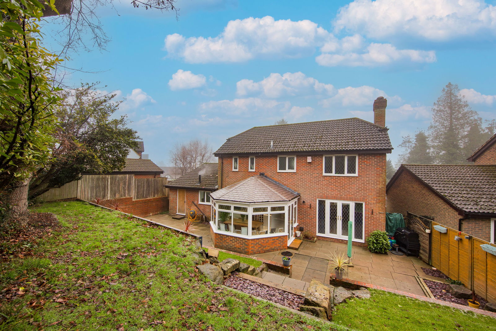 Two large patios either side of the conservatory, an attractive tiered and private landscaped garden which is laid to lawn accompanied by some mature trees and shrubs and an outside tap. Steps with Sussex stone surround rises to the top tier of the garden
