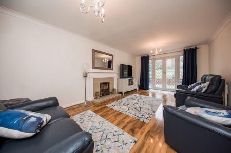 A bright and airy dual aspect room featuring an attractive fireplace with coal effect gas fire, hearth and wooden mantle with decorative surrounds. Recently installed oak effect laminate flooring, two radiators, window to the front with fitted blind and curtains and French doors with curtains leading out to the patio and garden beyond.