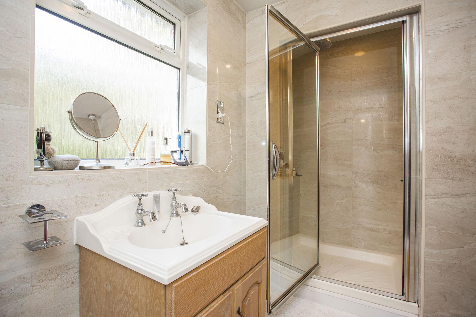 EN SUITE SHOWER ROOM: Porcelain tiled shower cubicle with power shower, low level wc, traditional style sink set into vanity unit with shelving, wall mounted chrome heated towel rail, wood flooring, porcelain tiled walling and window to side.