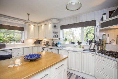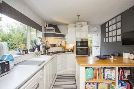 KITCHEN: A shaker style kitchen with a range of high and low level units with under unit lighting and grey roll top work surfaces and double sink with swan mixer tap. Appliances include a high level fan assisted oven with grill above and a 5-ring gas hob with extractor fan along with spaces for a low level fridge, dishwasher and washing machine. In addition is a breakfast bar with open shelving, drawer storage and wooden roll top work surface, an additional high level glass fronted cabinet, tiled flooring and part tiled walling.