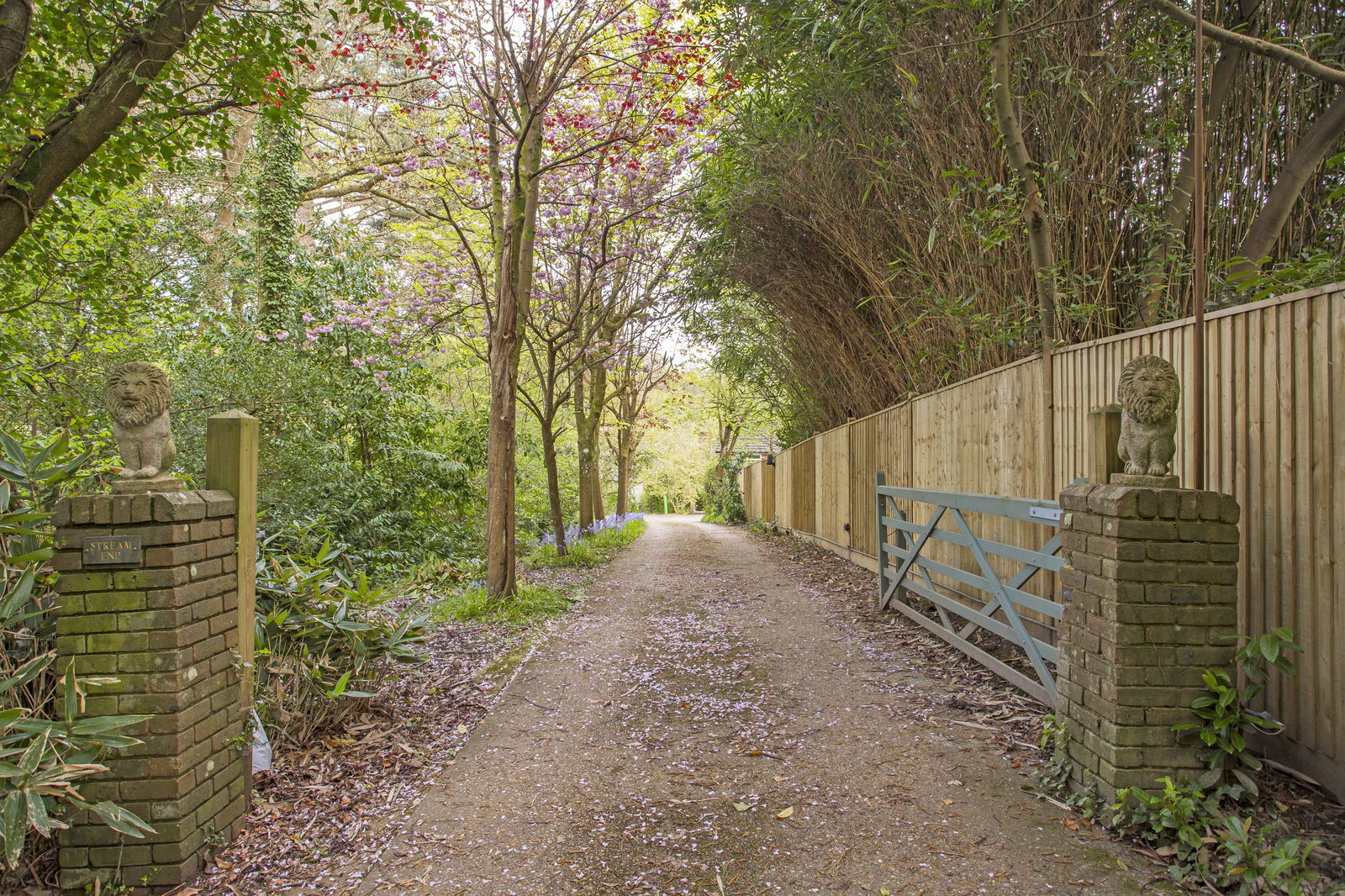 OUTSIDE FRONT: A five bar wooden gate opens to a long tree lined private driveway leading to the property with off road parking for numerous vehicles, access to the garage and steps leading down to the main entrance.