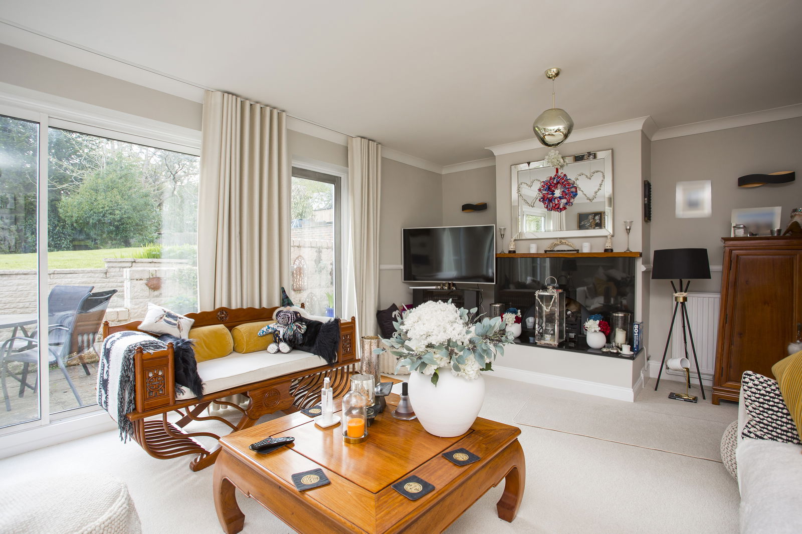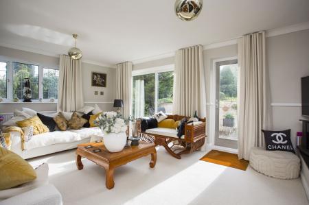 SITTING ROOM: A bright and airy dual aspect room enjoying a lovely outlook over the rear garden accessed via sliding doors, recently installed black marble fireplace incorporating a gas fire with wooden mantle and marble hearth, carpet as fitted, two radiators and a window to side.
