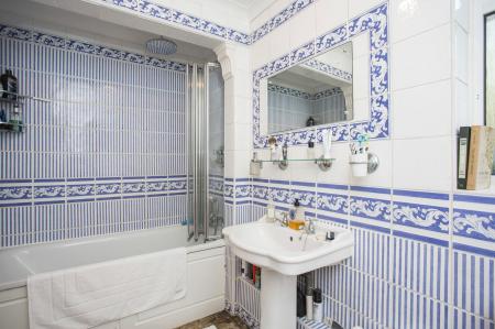 FAMILY BATHROOM: Panelled bath with attractive wall tiling, mixer tap, handheld shower attachment and rainfall power shower over, low level wc, traditional wash hand basin with traditional taps, chrome towel rail, part tiled walling and window to side.