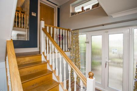 ENTRANCE HALL: Two under stairs built-in storage cupboards, additional tall built-in cupboard, oak engineered flooring, two radiators with covers and wall lighting.