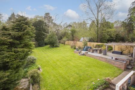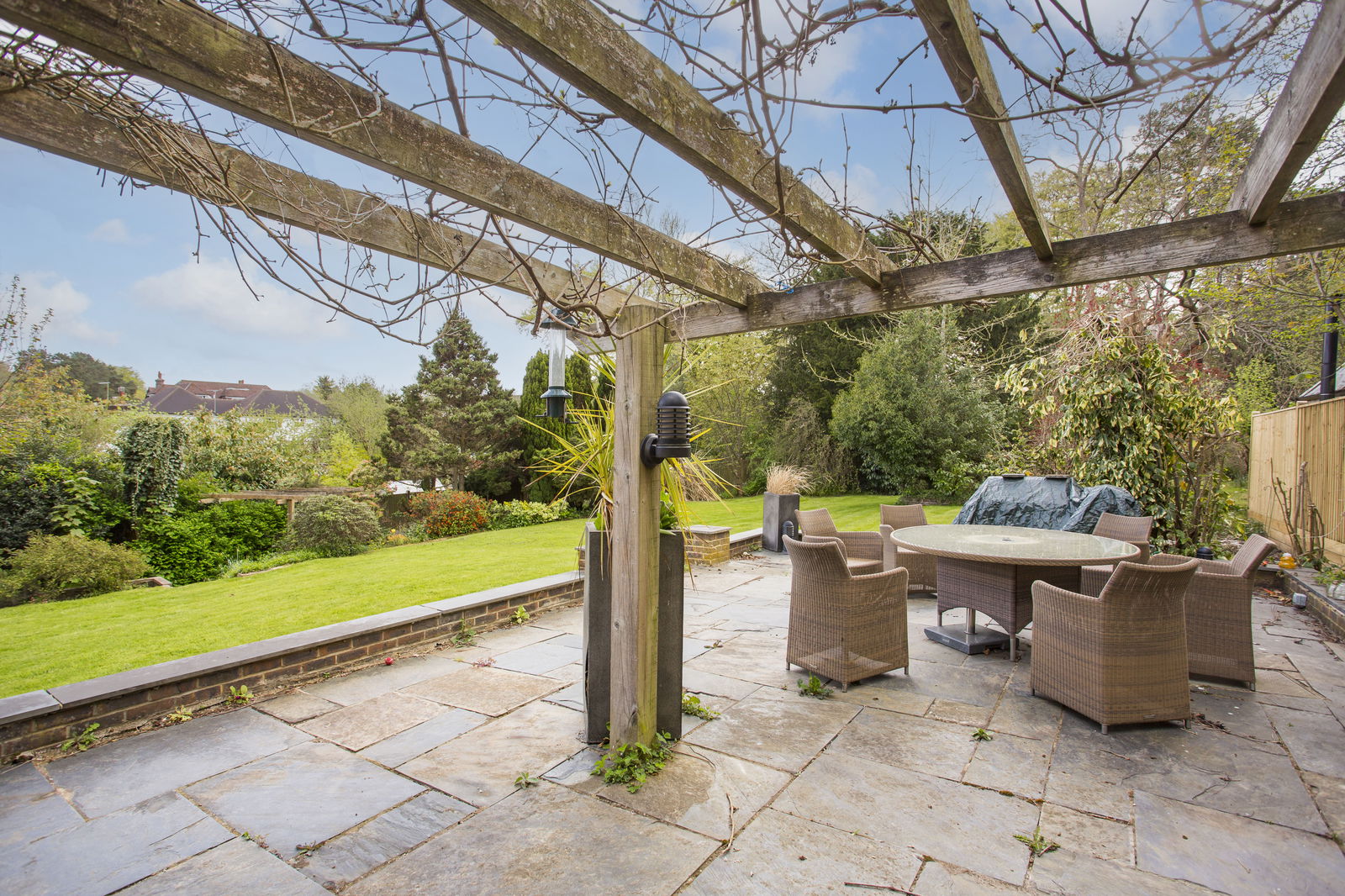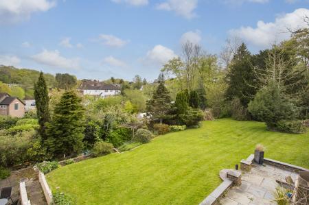 OUTSIDE REAR: An extensive garden benefiting from a large L-shaped paved patio immediately adjacent to the property with steps rising to a large expanse of lawn surrounded by an extensive range of mature and established planting. In addition is a large limestone paved raised patio with wooden pergola ideal for outside entertaining.