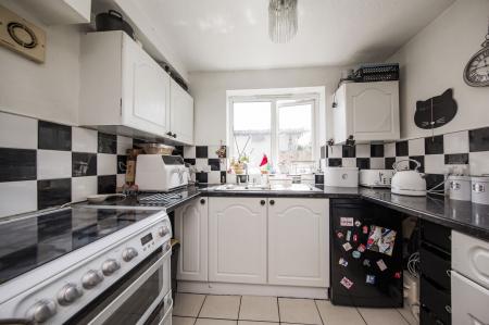 KITCHEN: Range of high and low level shaker style units with black granite effect roll top work surfaces incorporating a stainless steel sink. Appliances include a fan assisted oven and grill with four ring gas hob above and space for a low level fridge. Tiled flooring and obscured window to side.