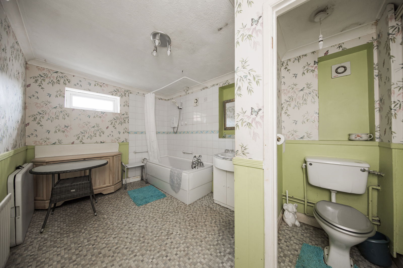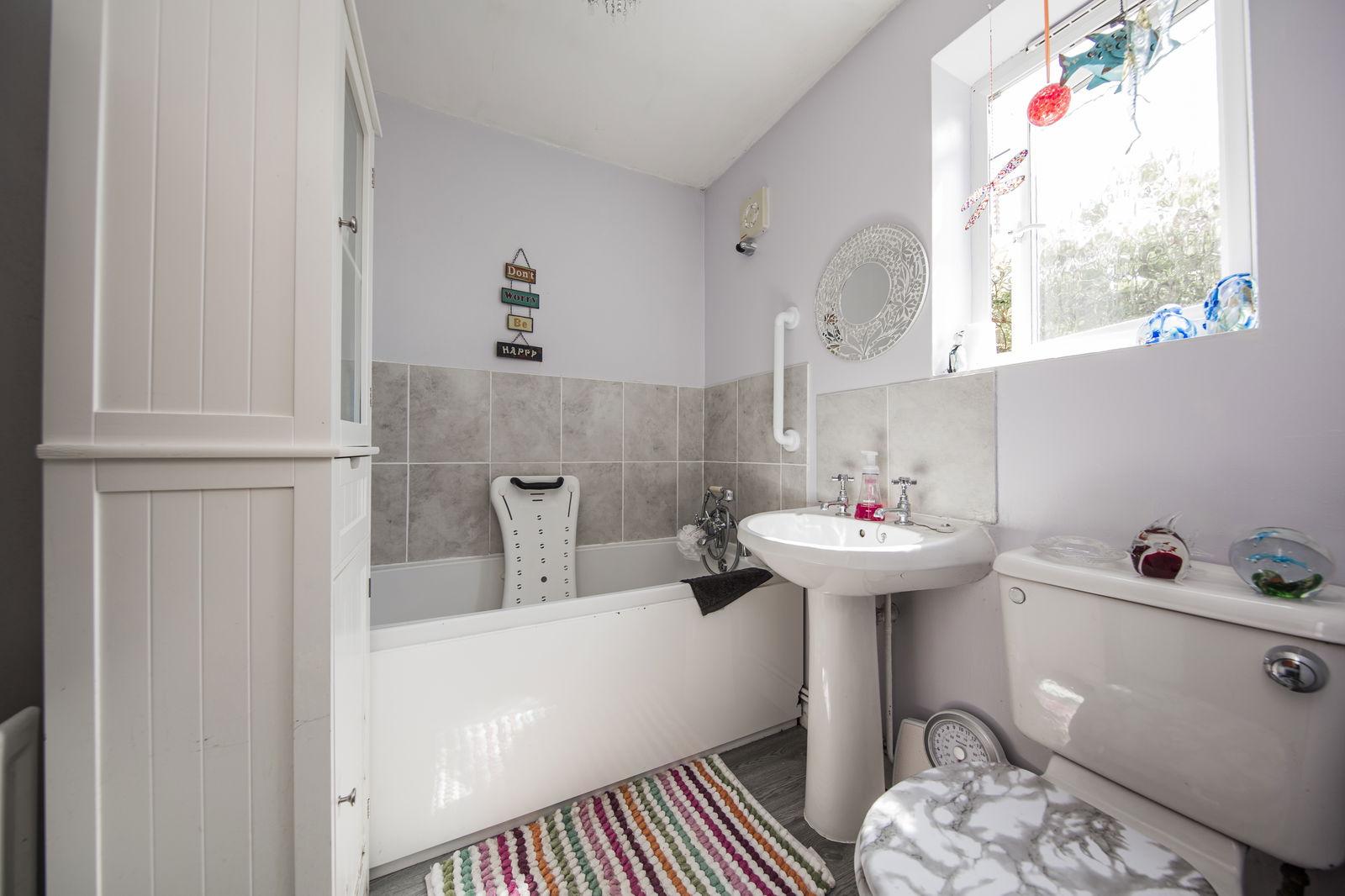 FAMILY BATHROOM: Panelled bath with Triton shower over, traditional style taps and handheld shower attachment, wash hand basin with mixer tap set into a vanity unit, separate area with low level wc and part tiled and panelled walling.