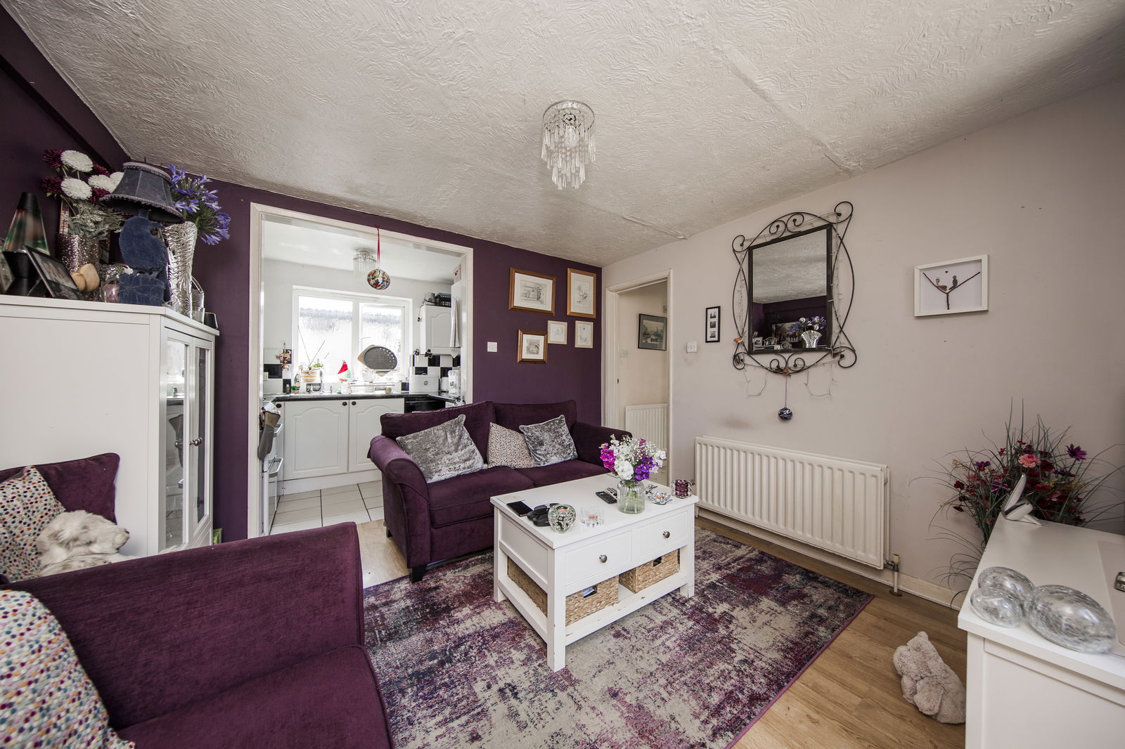 SITTING/DINING ROOM: Feature fireplace incorporating electric fire insert (currently not in use), plenty of room for sitting and dining room furniture, wood effect laminate flooring, two radiators, smoke alarm, Velux window and bay window to front.