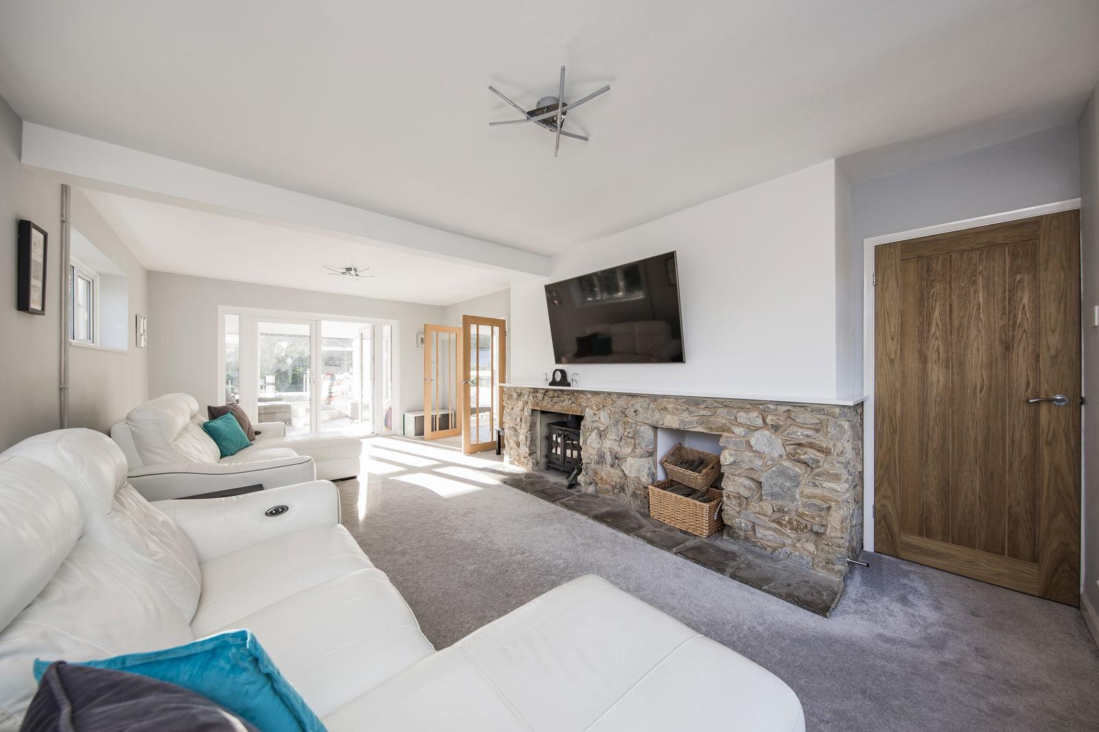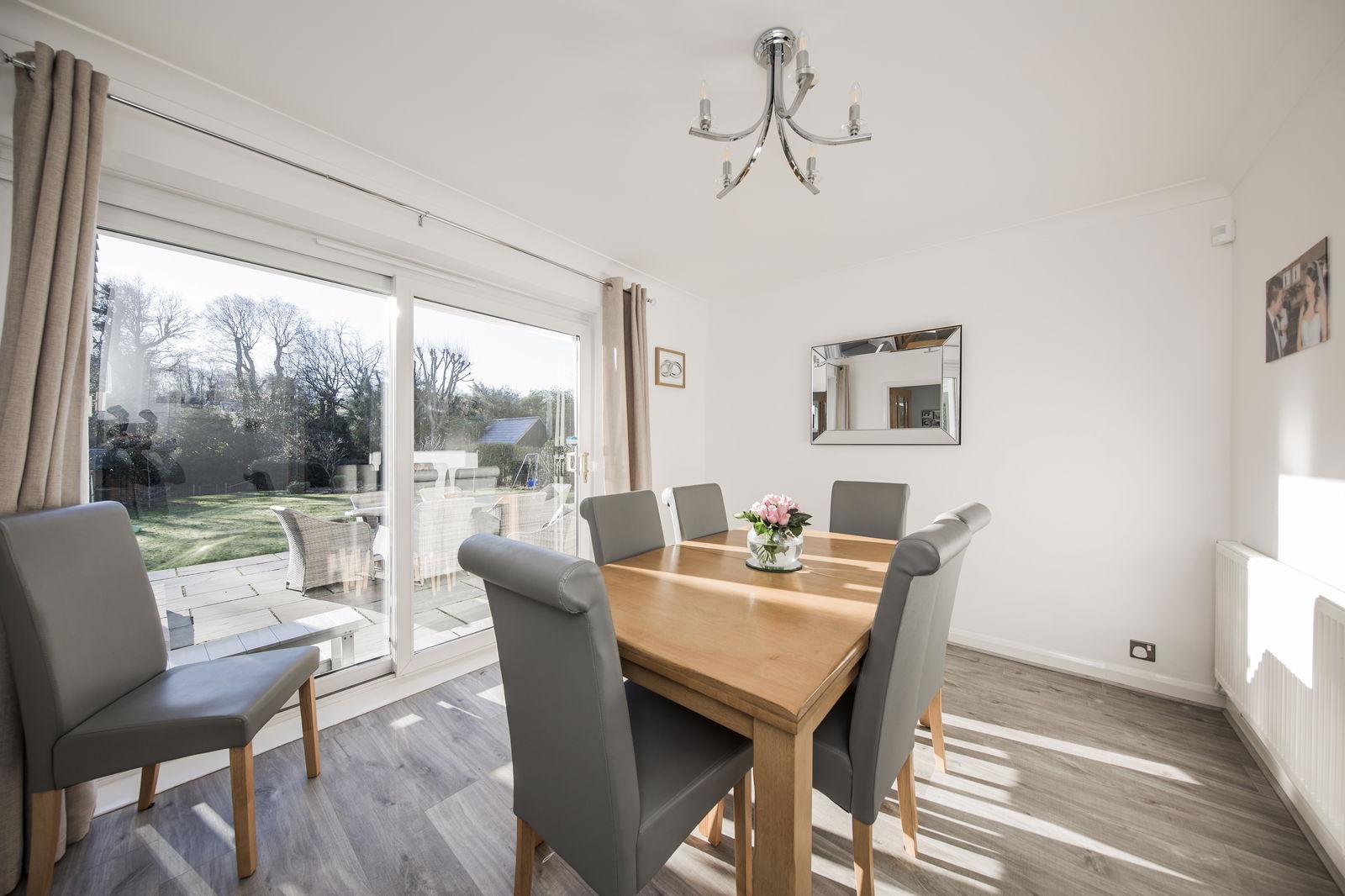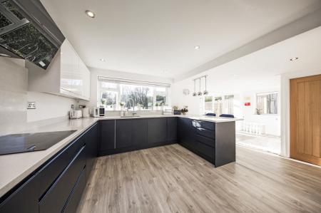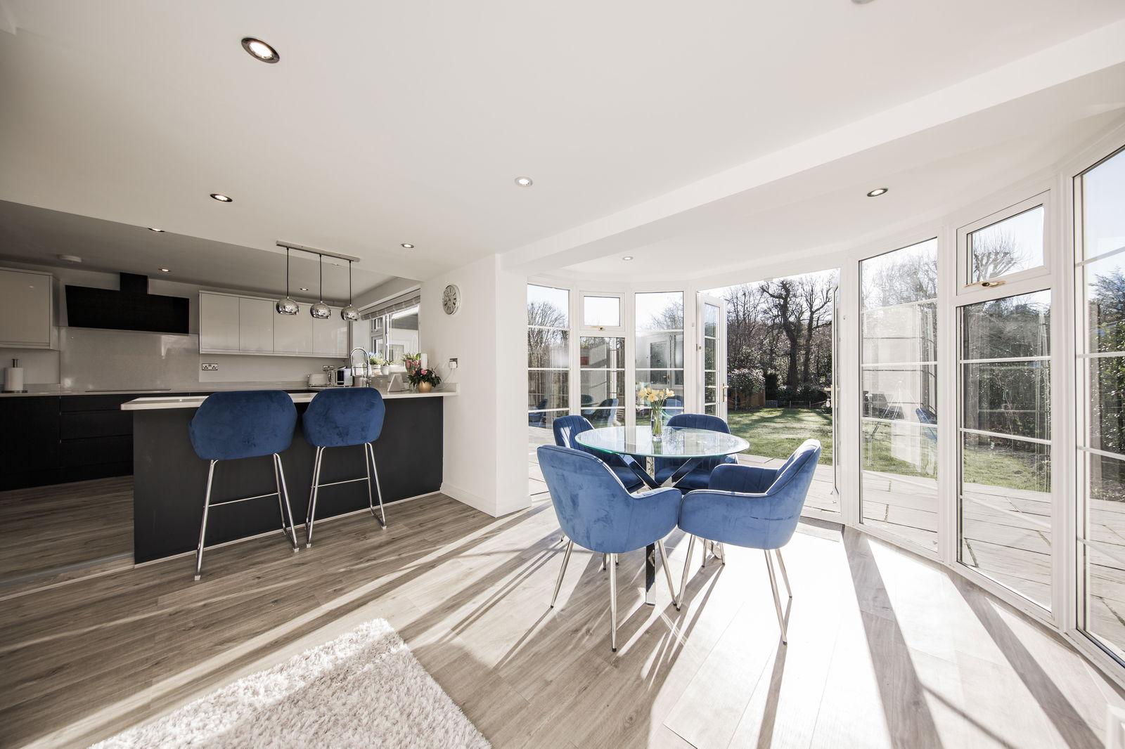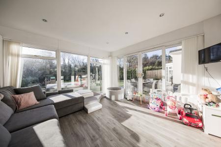 Creating a great deal of light are floor to ceiling windows and doors leading directly out to the rear patio and garden beyond, LED downlighters and continuation of vinyl flooring.