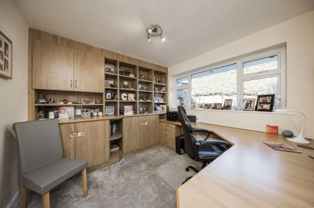 Range of bespoke office furniture to include a workstation area and a selection of wall, base and drawer units, fitted carpet and large window to front.