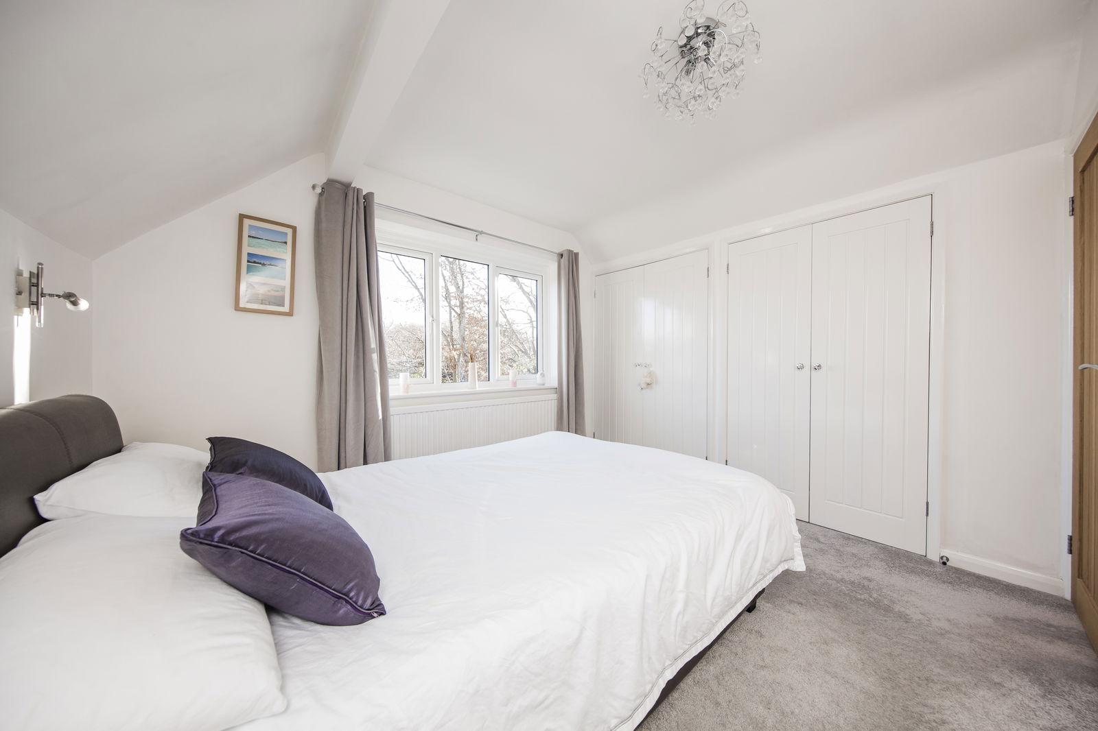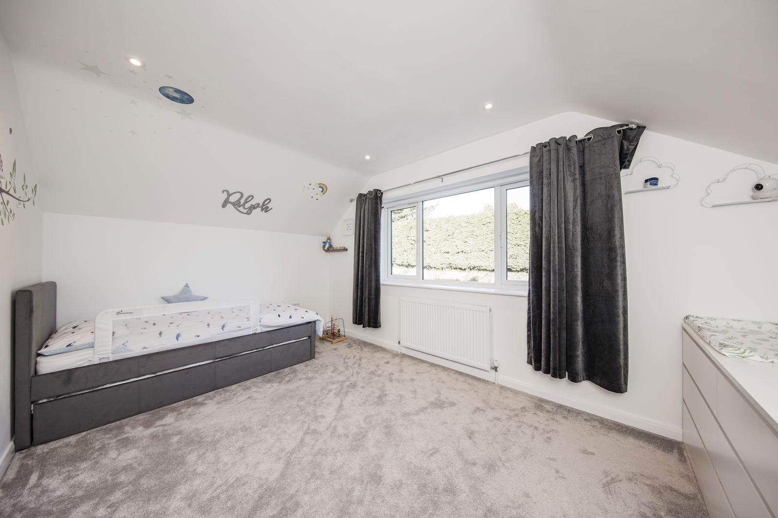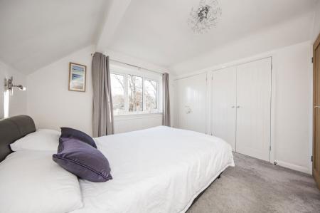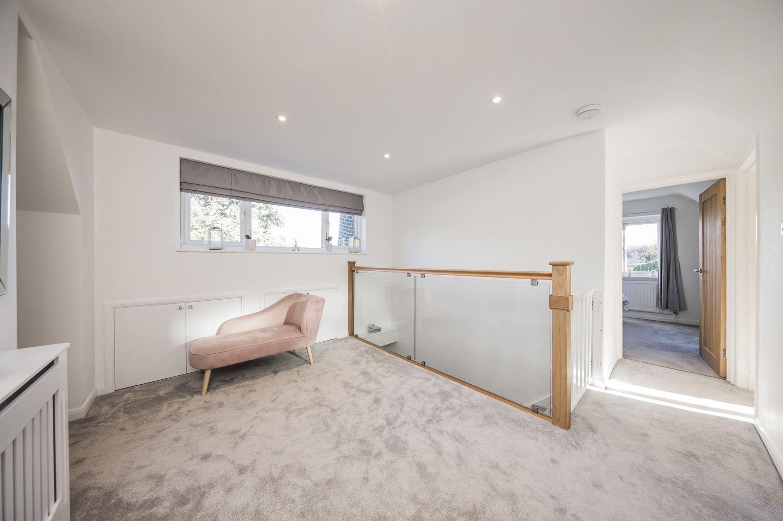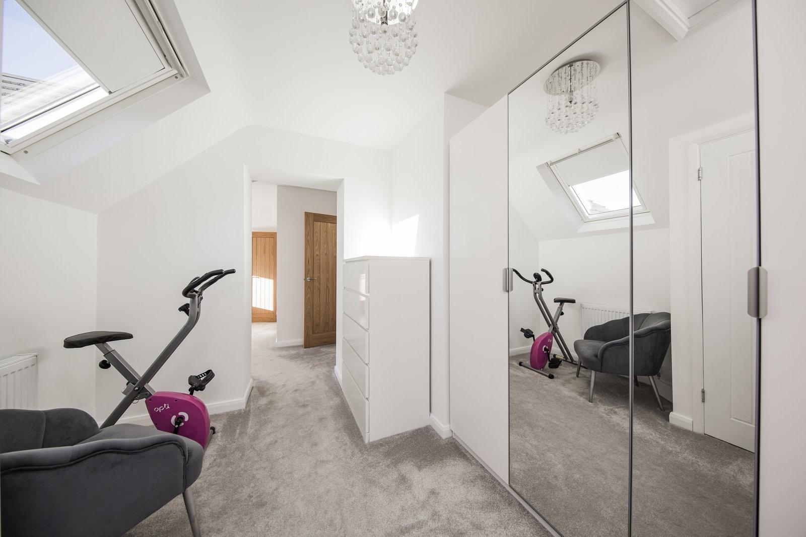A generous area with large window to front, good size storage cupboard, eaves storage, radiator with wooden cover, smoke detector, fitted carpet and inset LED lighting.