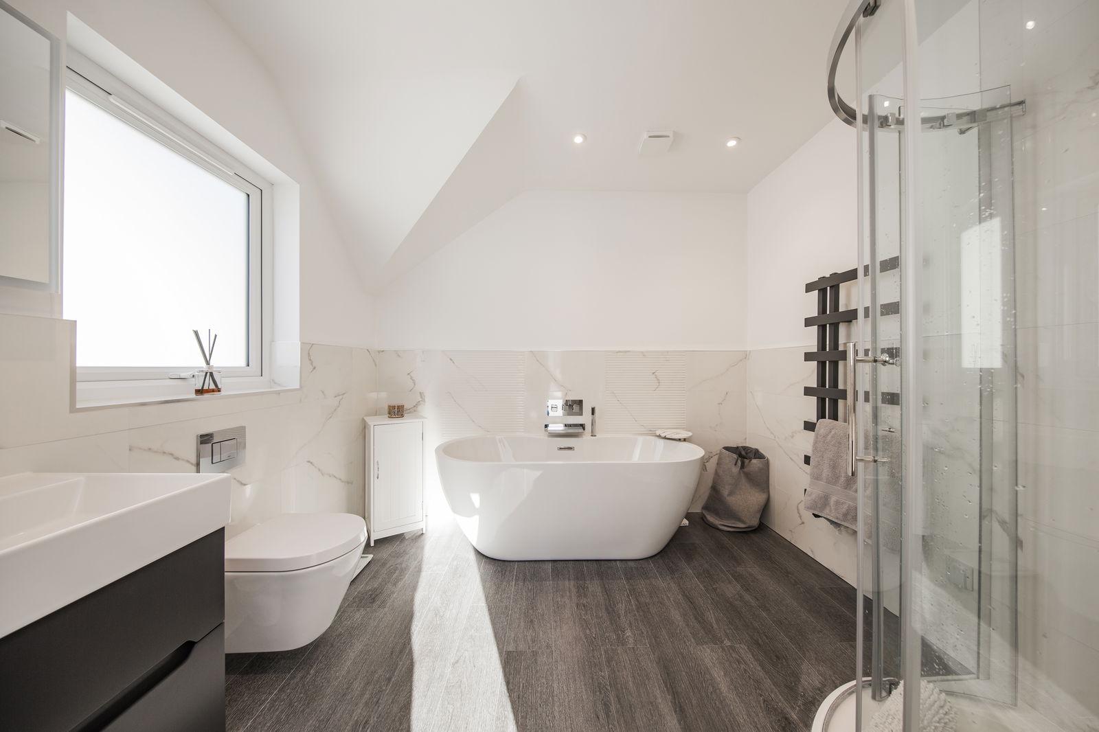 Freestanding slipper bath with side taps and separate shower attachment, fully tiled cubicle with integrated showerhead and separate shower attachment, floating dual flush wc, large vanity wash hand basin with waterfall taps and storage under, heated towel rail, tiled marble surrounds, LED lighting and window to side.