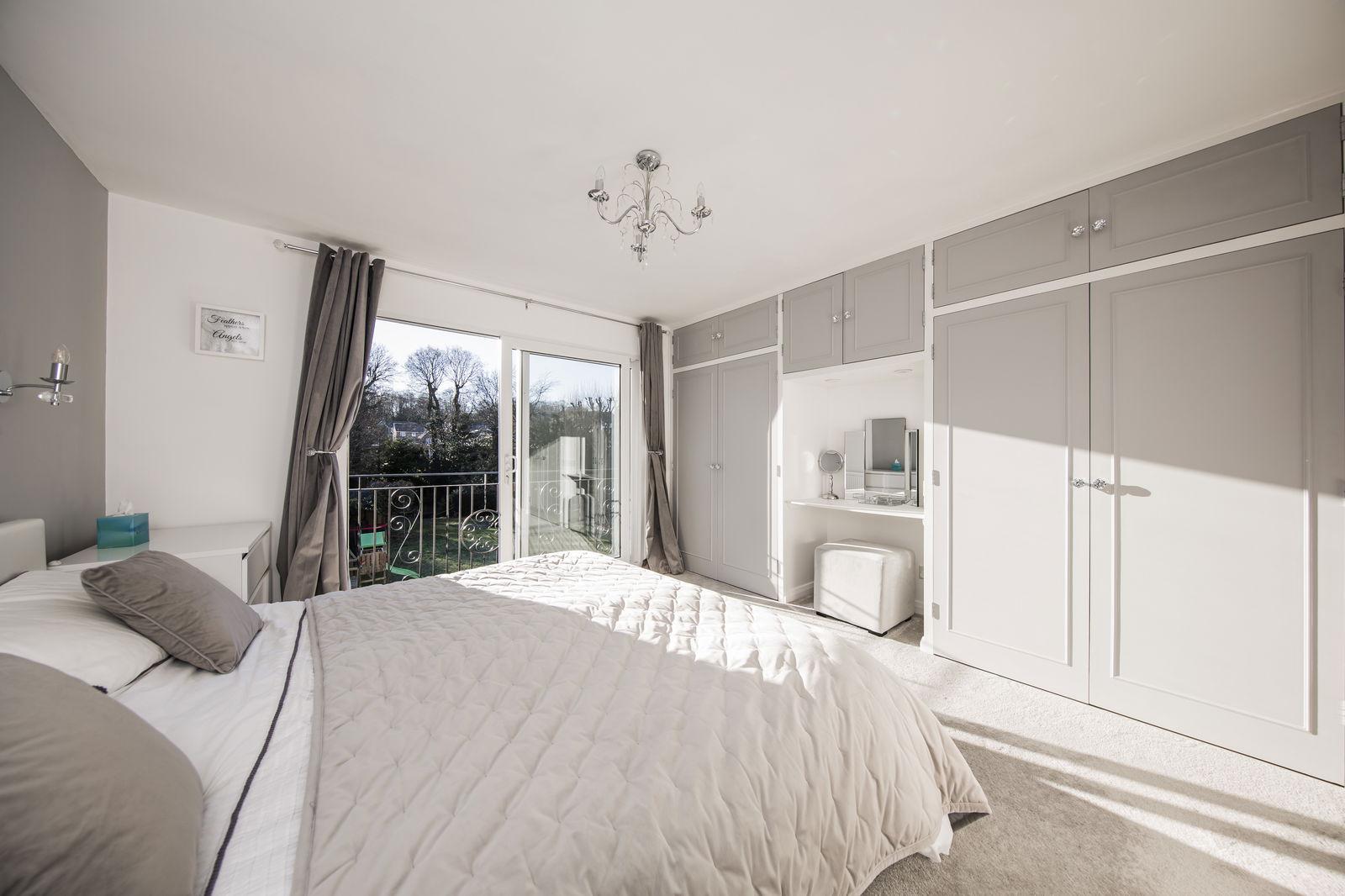 Two double fitted wardrobes, radiator, fitted carpet, large sliding patio doors open to a rear balcony enclosed via iron balustrades, and door into: