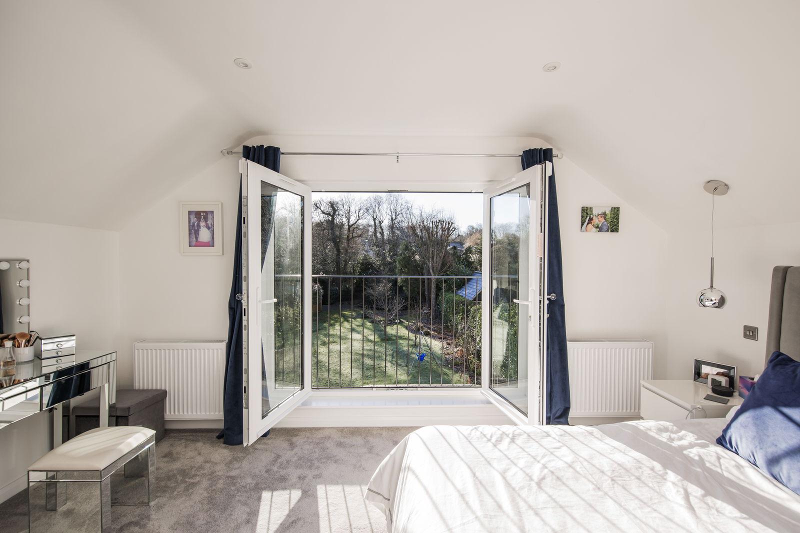 Double doors opening to a Juliet balcony enclosed by wrought iron balustrade, fitted carpet, inset LED lighting, radiator and door into:
