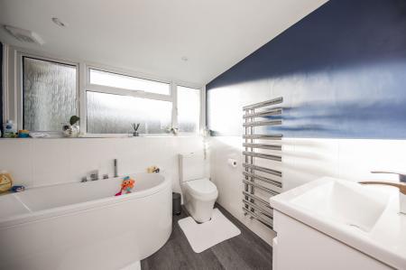Panelled bath with side taps and separate shower attachment, tiled shower cubicle with integrated shower, dual flush low level wc, vanity wash hand basin with waterfall taps and storage under, chrome heated towel rail, vinyl flooring and obscured window to rear.