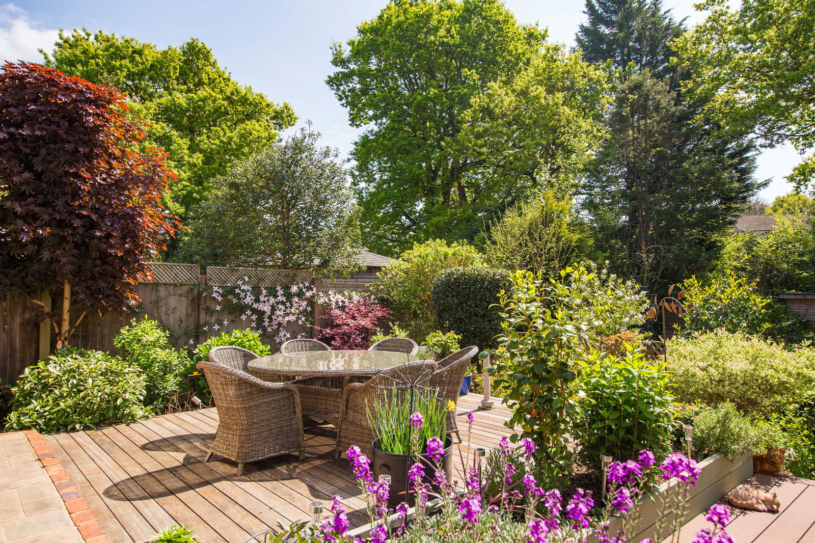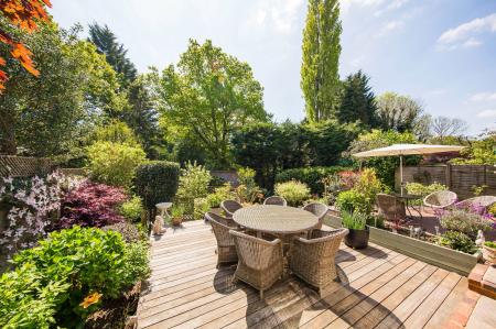 OUTSIDE REAR: An attractive and mature southerly facing garden featuring two decked areas providing ample room for garden furniture and outside entertaining. There is a timber shed, greenhouse and a vast selection of planting to include Acers, trees and shrubs.