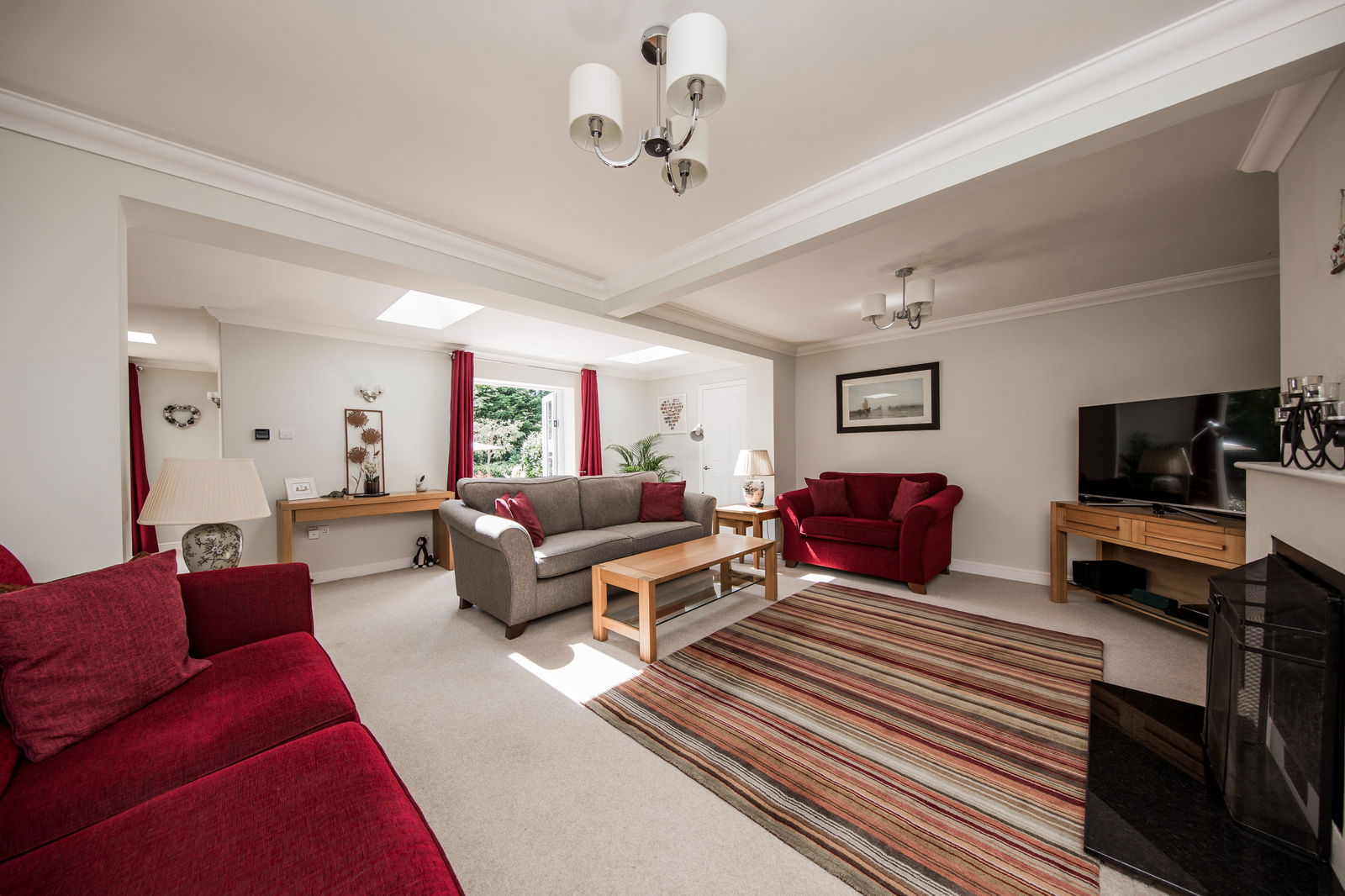 SITTING ROOM: Fireplace with open fire with iron basket surround and granite hearth, radiator, fitted carpet, remote control Velux skylights and French doors opening to rear patio.