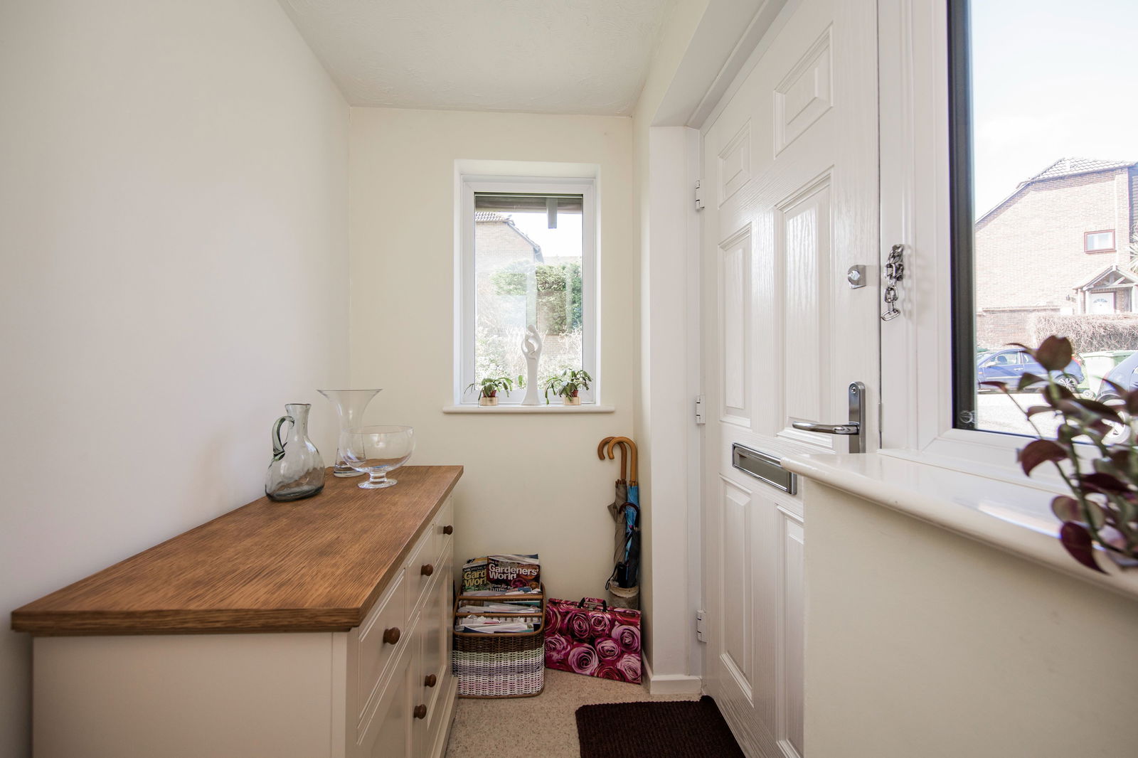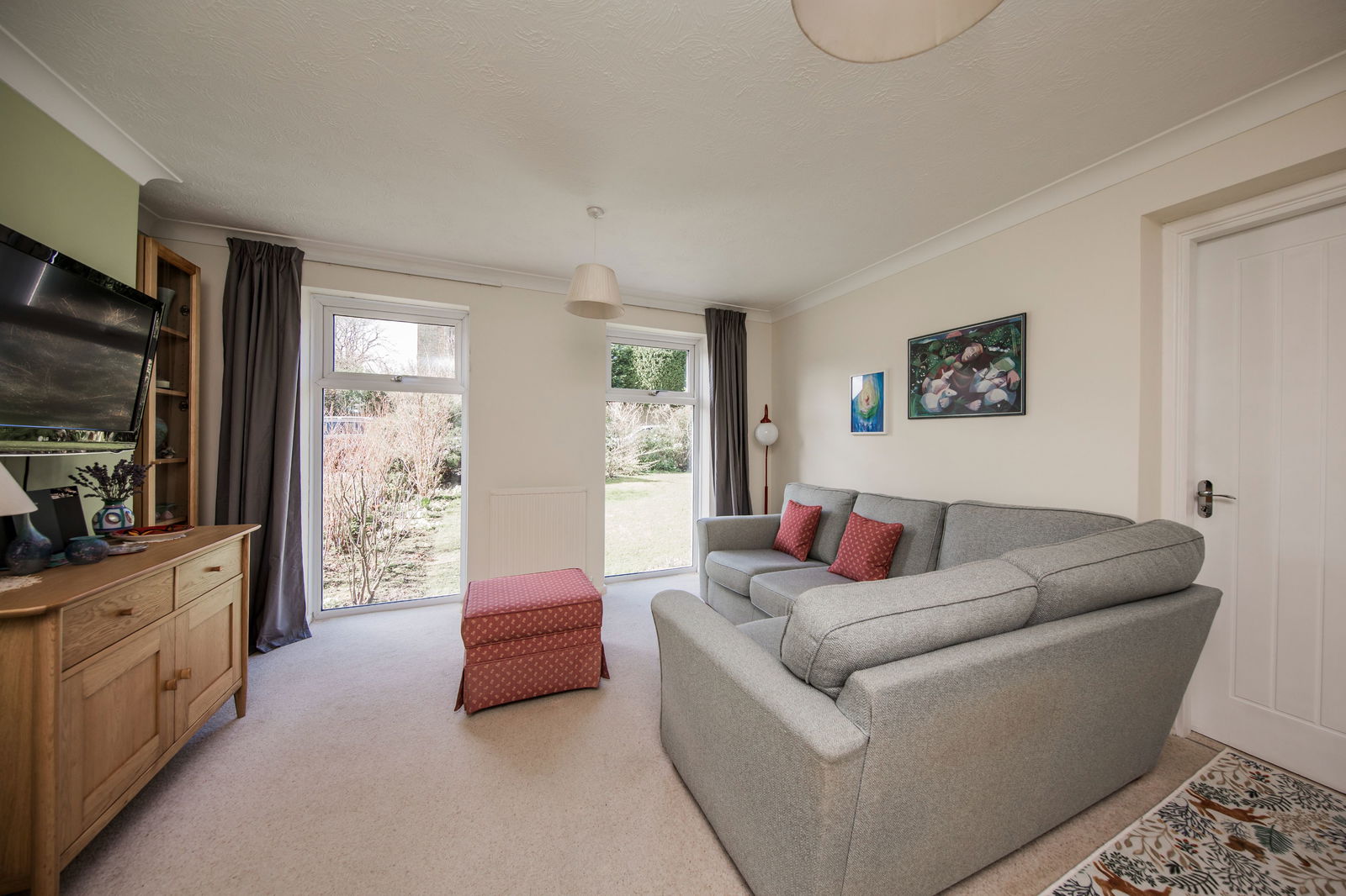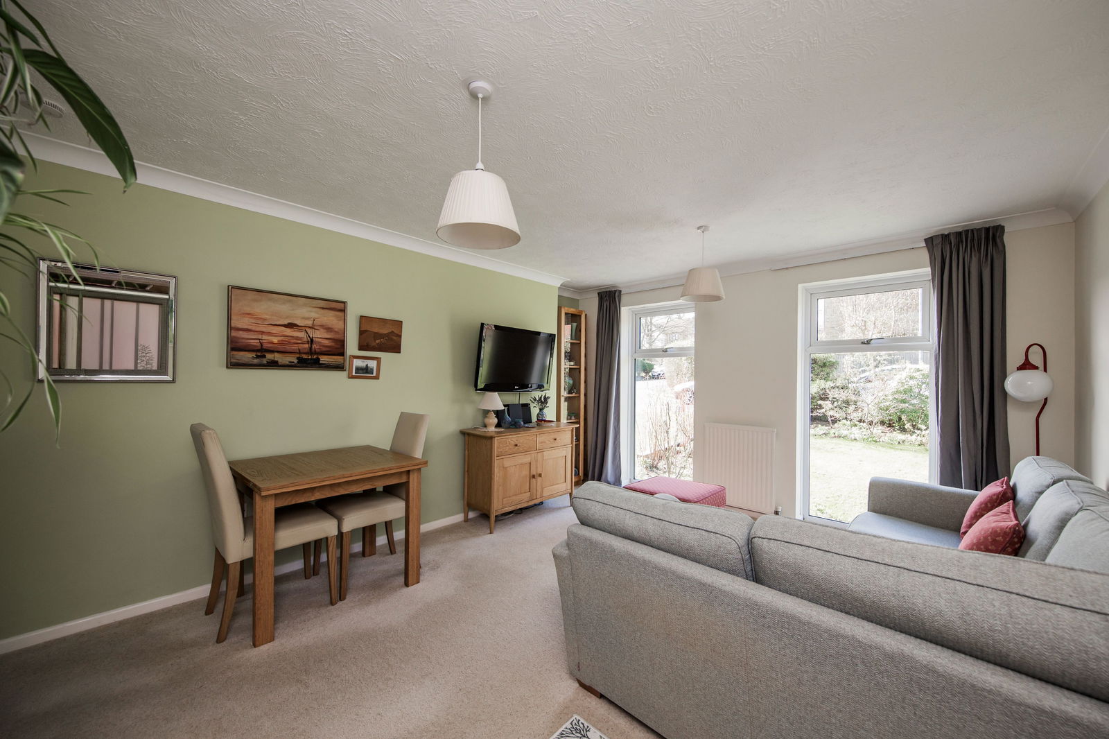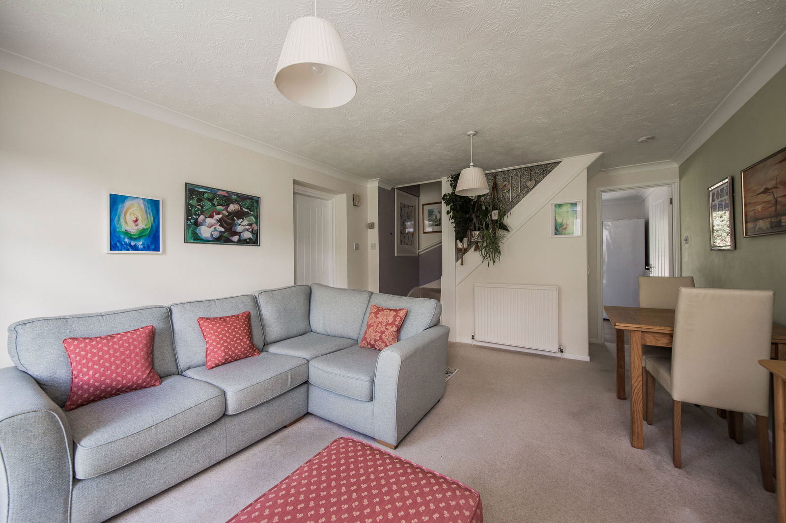 Plenty of space for sitting and dining room furniture, fitted carpet and two radiators. Under stairs storage cupboard, further cupboard housing electric consumer unit and two floor to ceiling windows overlooking the front garden.