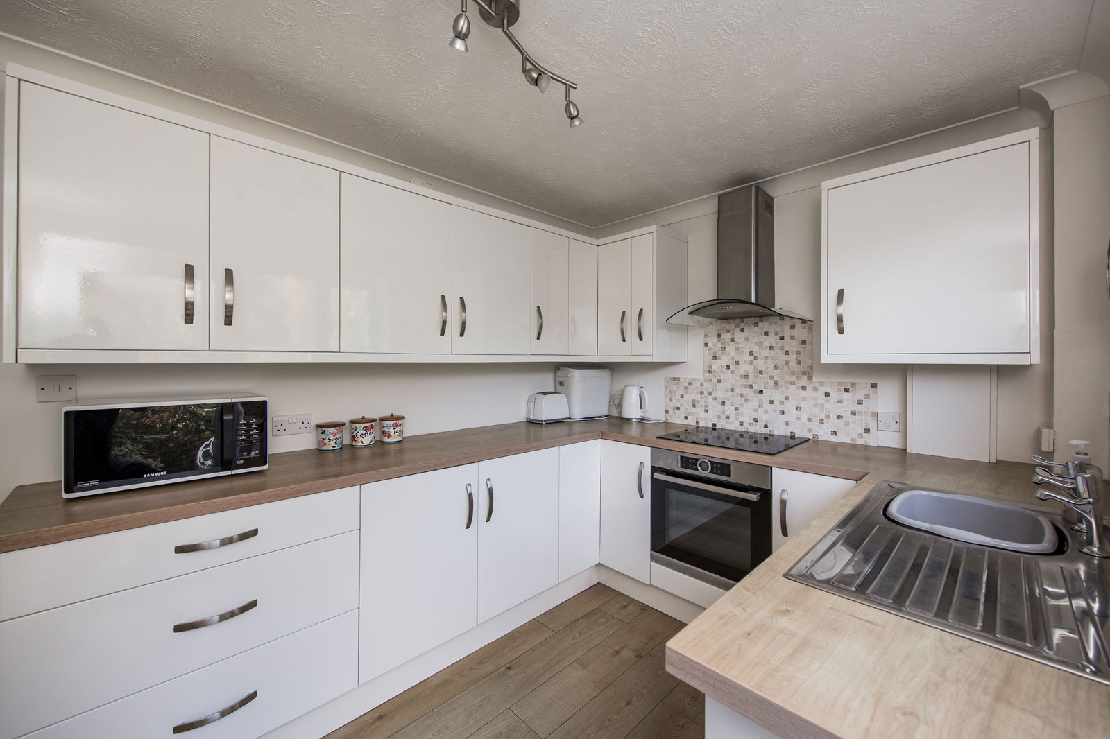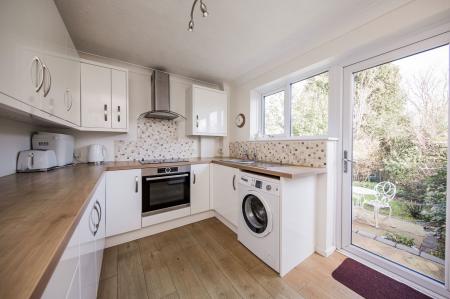 A contemporary high gloss range of high and low level units with wooden roll top worksurface, stainless steel sink and mosaic tiled splashback. Appliances include a fan assisted oven and a four ring Induction hub with extractor fan above along with spaces for a tall fridge/freezer and washing machine. Additional high level unit housing the Worcester Bosch boiler, radiator, wood effect laminate flooring, window to rear and door providing access out to the rear garden and garage.