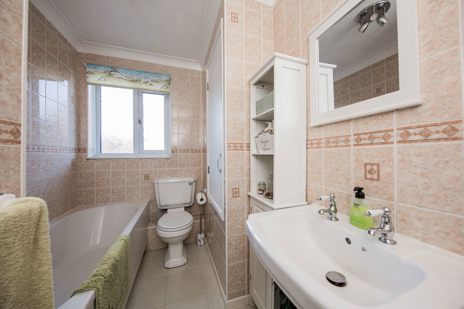 Panelled bath with attractive traditional style mixer taps and handheld attachment, low-level wc, pedestal wash and basin and wall lighting. Cupboard housing the hot water tank with wooden slatted shelving, tiled flooring, fully tiled walling, radiator and obscured window to the side.