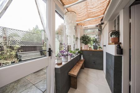 REAR LOBBY: Continuation of C P Hart tiled flooring, glazed windows with polycarbonate roof and glass panelled door opening out to the side return.