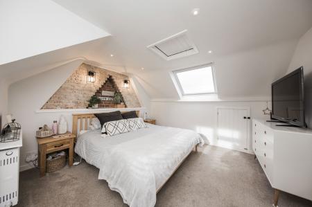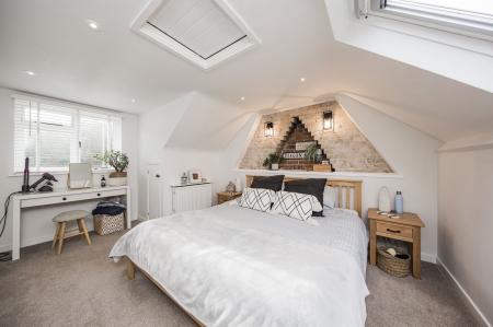 BEDROOM: Attractive exposed brick area with inset shelving, eaves storage cupboards, radiator, fitted carpet, Velux roof window with blind and window to rear.