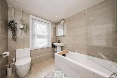 FAMILY BATHROOM: Comprising a Bette steel bath with tiled surrounds and Crosswater MPRO deck mounted bath levers with integrated overflow waterfall bath filler and integrated digital shower, dual flush Durvavit Me Starck wc and freestanding basin/pedestal with Crosswater MPRO single lever mixer tap with clic clac waste. Chrome ladder style heated towel rail, full height tiled walls, extractor fan and sash window to rear.