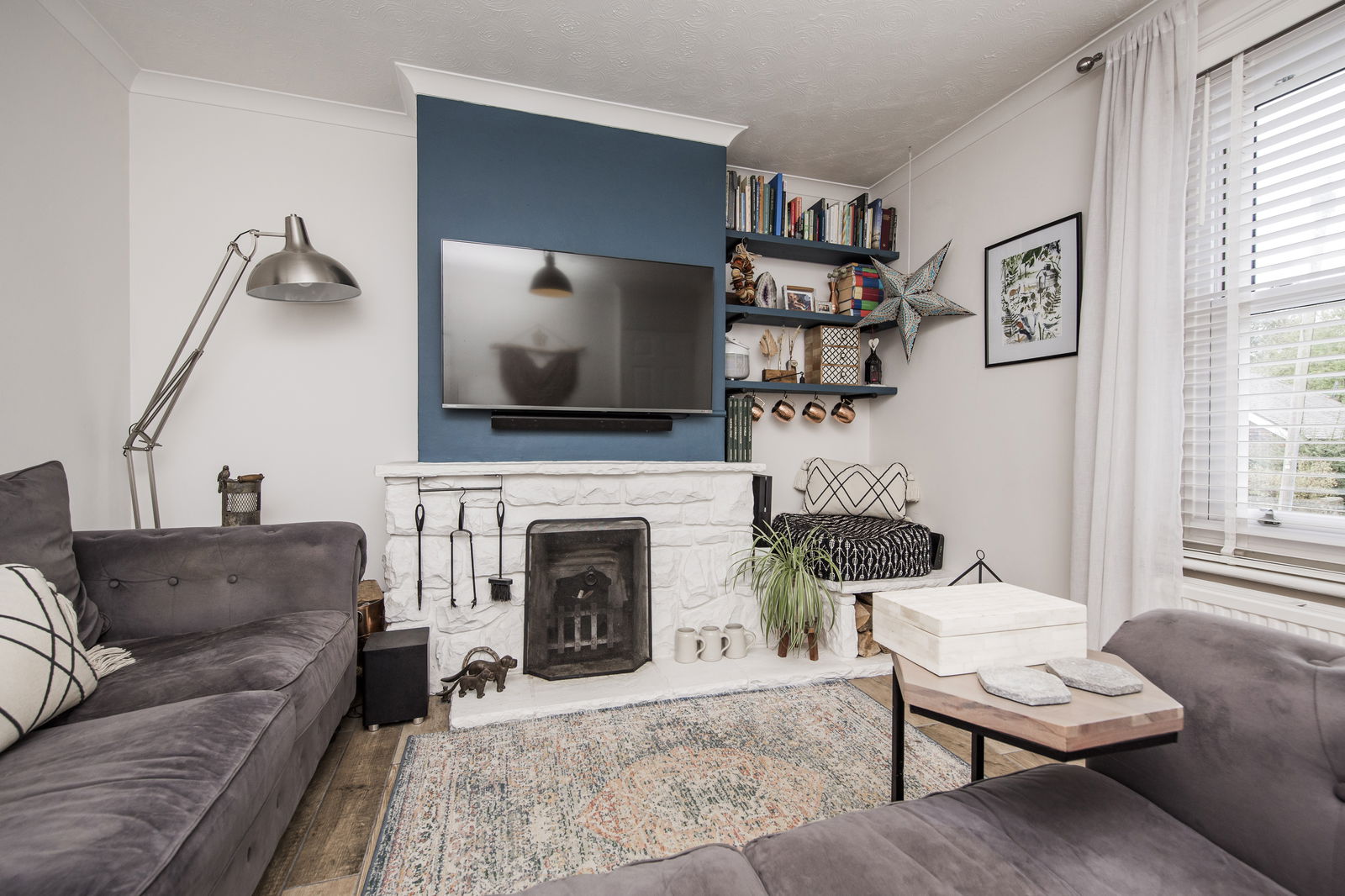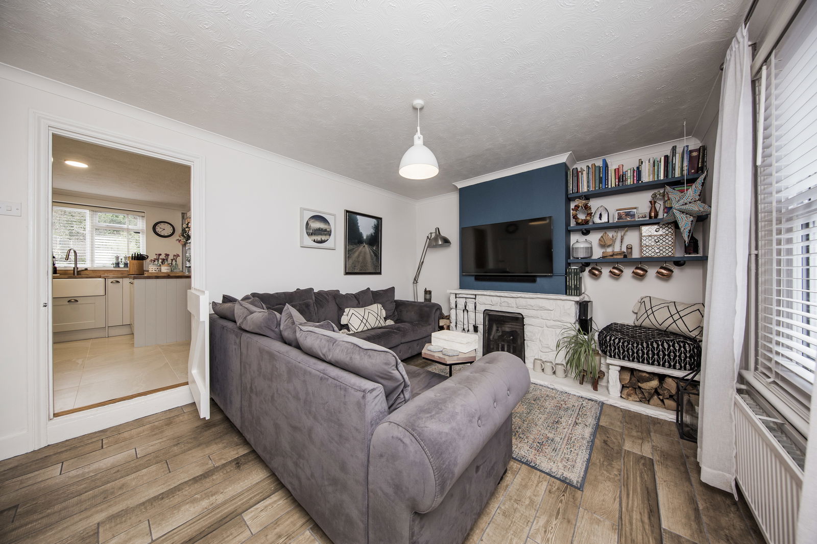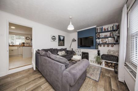 SITTING ROOM: Feature fireplace with inset iron basket, stone mantel, surround and hearth, stone wood store area, under stairs cupboard with electric consumer unit, smart meter, gas meter and shelving. Continuation of wood effect porcelain tiled flooring, radiator and sash window to front.