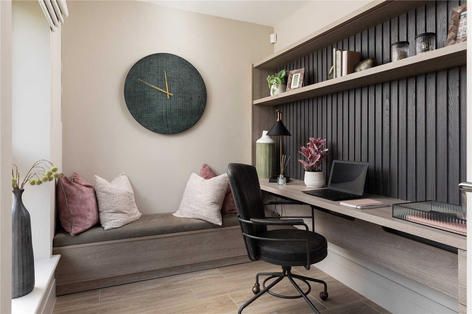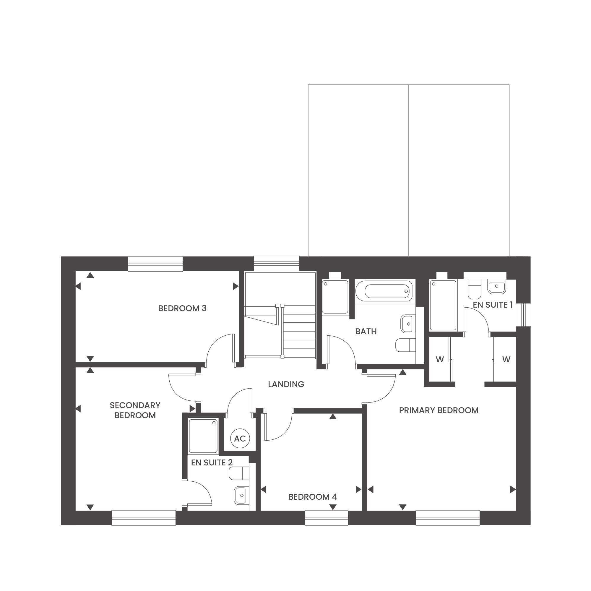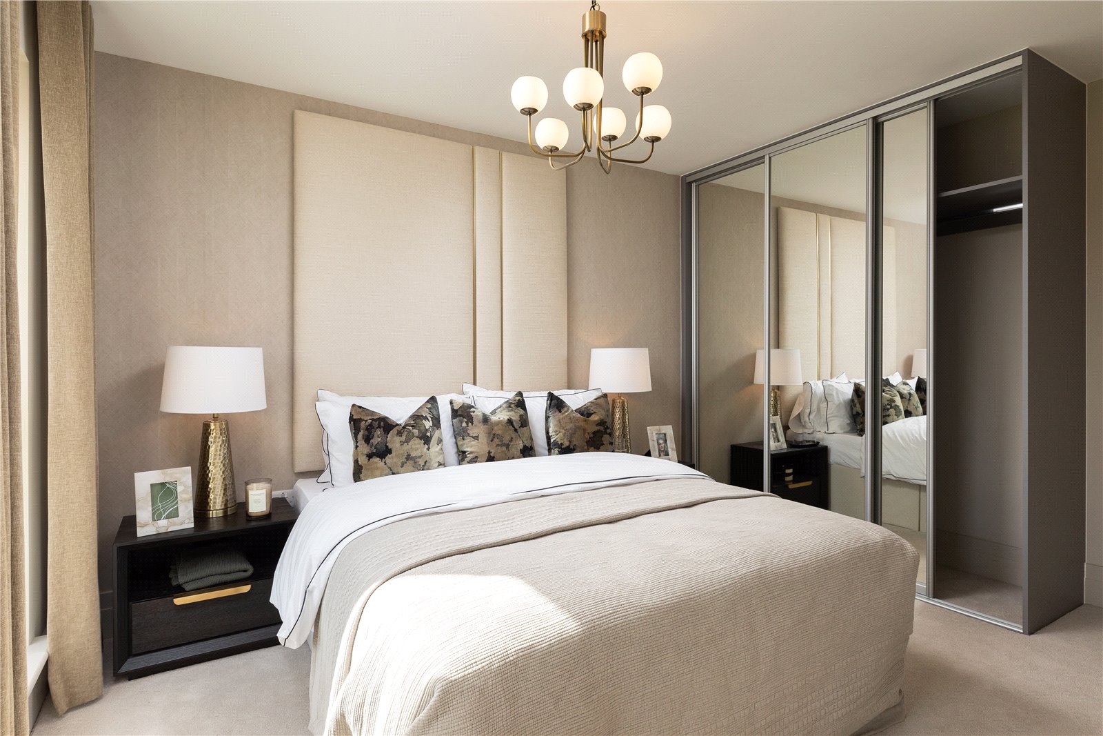 Upstairs, there are four bedrooms, with sleek en suites to both the primary and secondary rooms. The primary bedroom also features bespoke fitted wardrobes, creating a dressing area that leads through to the en suite.